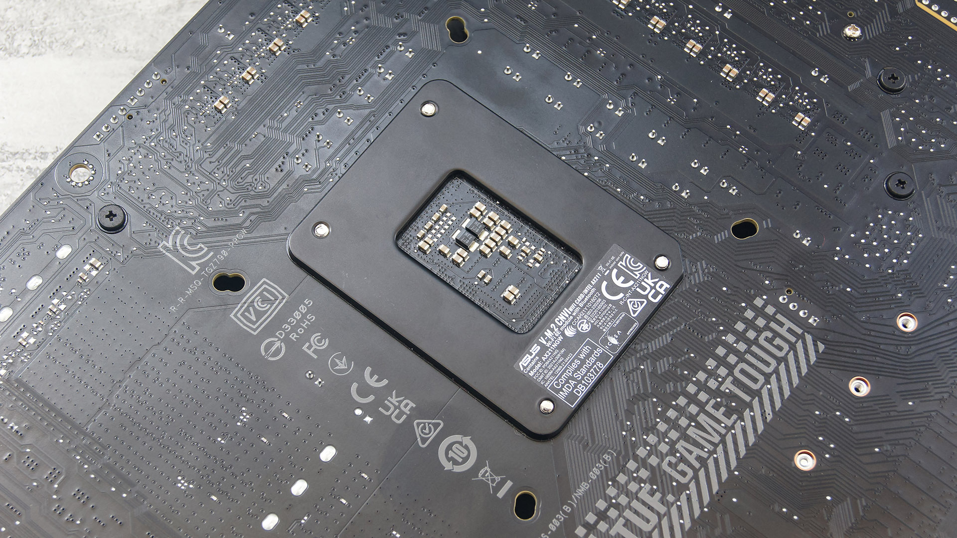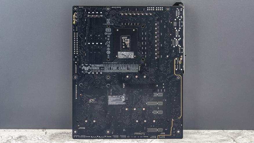 Тыльная сторона TUF Gaming Z790-Pro WIFI ничем особенно не примечательная. Практически голый текстолит с редкими россыпями малоинтересных элементов. Кстати, сам текстолит здесь шестислойный и это общем-то норма для платы подобного сегмента.