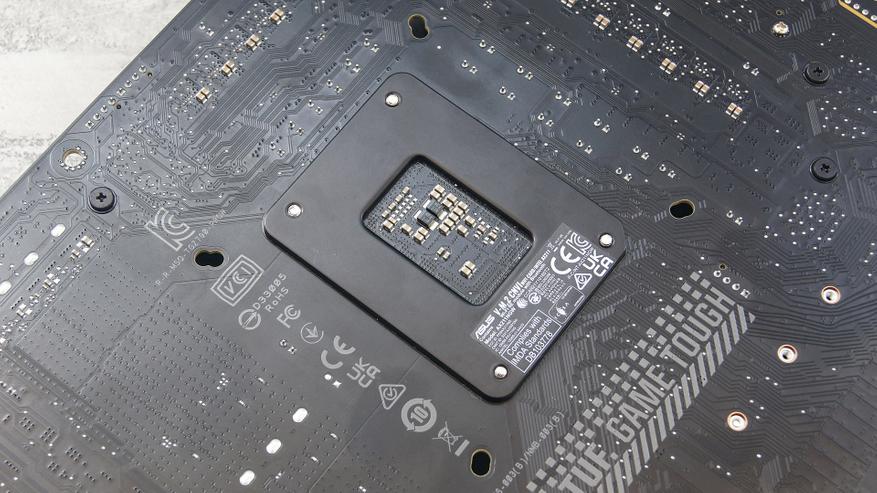 Бэкплейт сокета выполнен в черном цвете и практически не привлекает внимание. Однако рядом с ним отчетливо видны сдвоенные, почти овальные, отверстия для кулера или иной системы охлаждения. Это интересный момент: ASUS TUF Gaming Z790-Pro WIFI может принять как старые системы охлаждения для процессоров с сокетами LGA1200/115x, так и современные кулеры и системы жидкостного охлаждения, которые уже оснащены необходимыми креплениями для пока еще последнего сокета Intel. Но при использовании старых СО стоит учесть тот факт, что процессоры с сокетом LGA1700 имеют меньшую высоту по сравнению с процессорами LGA1200/115x.