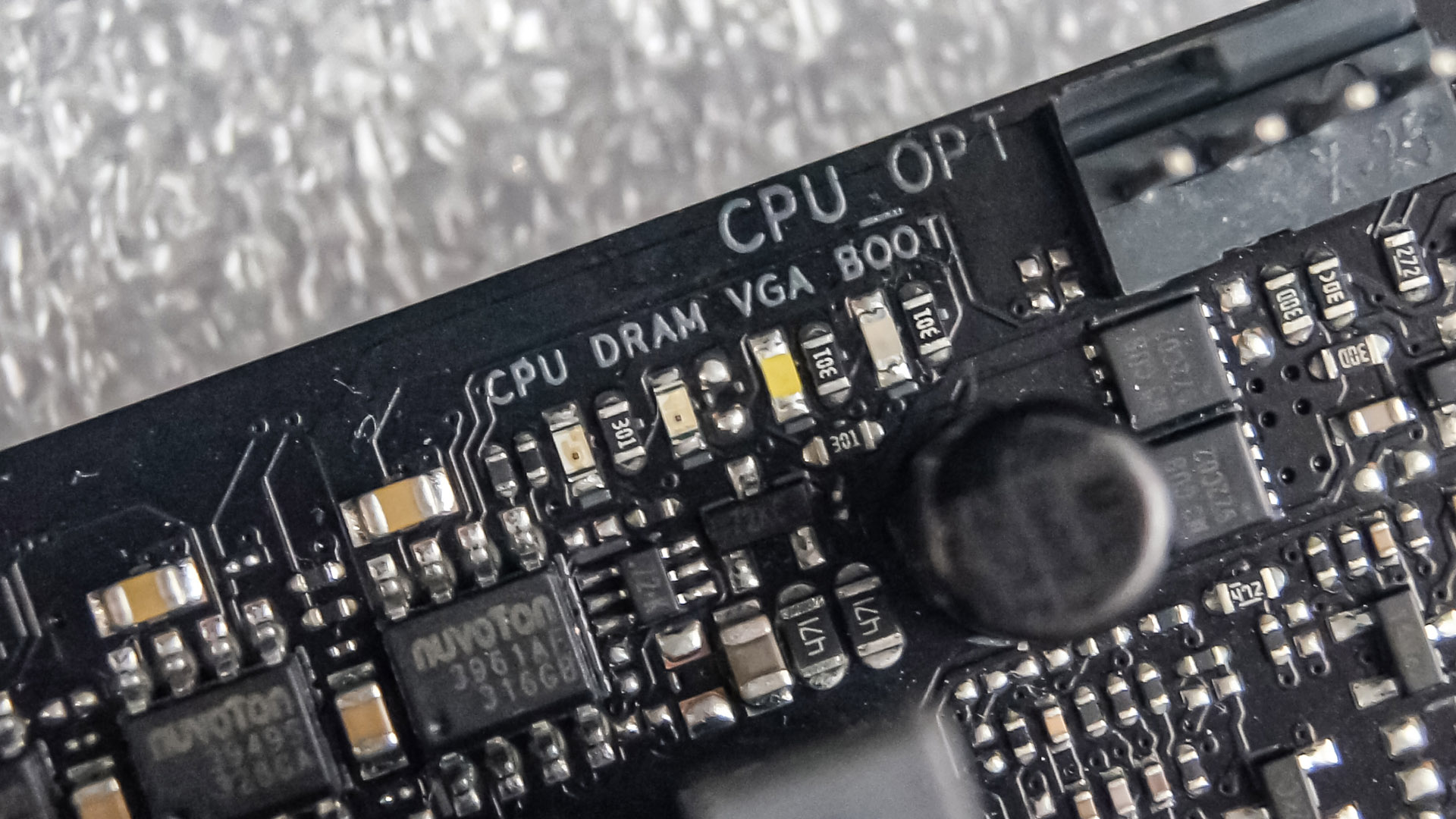 В верхнем правом углу, над слотами памяти, есть четыре светодиода Q-LED — система быстрой диагностики проблем запуска. Полезная функция. Иногда.
