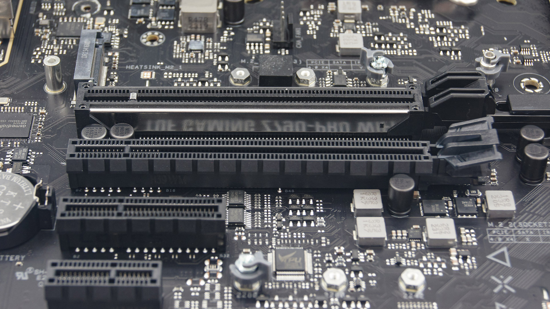 Радиатор чипсета у ASUS TUF Gaming Z790-Pro WIFI довольно массивный, но плоски и, если хотите, приземистый. Просто крупный кусок алюминия (судя по весу) с минимальной профилировкой и отсутствием оребрения. Крепление к текстолиту производится двумя винтами. Надежно.