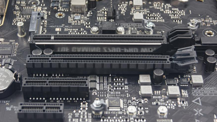 Верхний PEG-слот на плате усилен металлической рамкой и оснащен дополнительными точками пайки по технологии SafeSlot. Разъем использует процессорные линии и поддерживает интерфейс PCIe 5.0 x16.