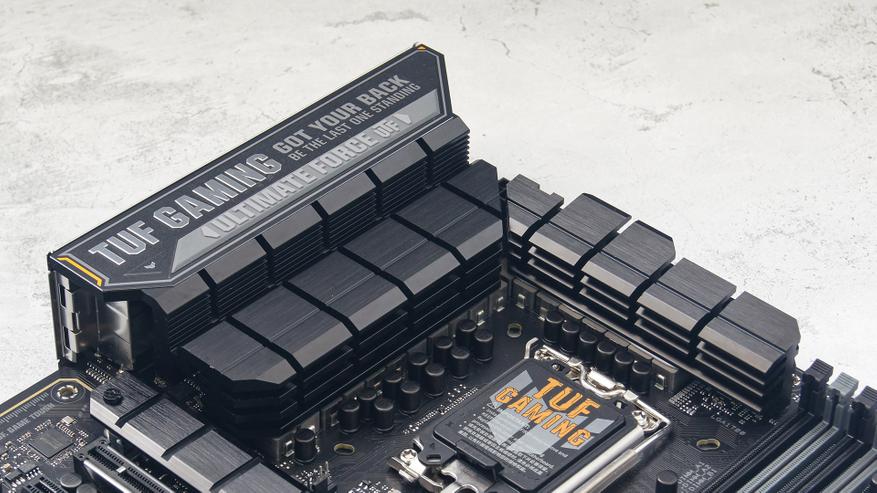 Цепи питания ASUS TUF Gaming Z790-Pro WIFI оснащены двумя достаточно массивными радиаторами с приличным оребрением, которые через термопрокладки контактирует как со сборками, так и с дросселями.