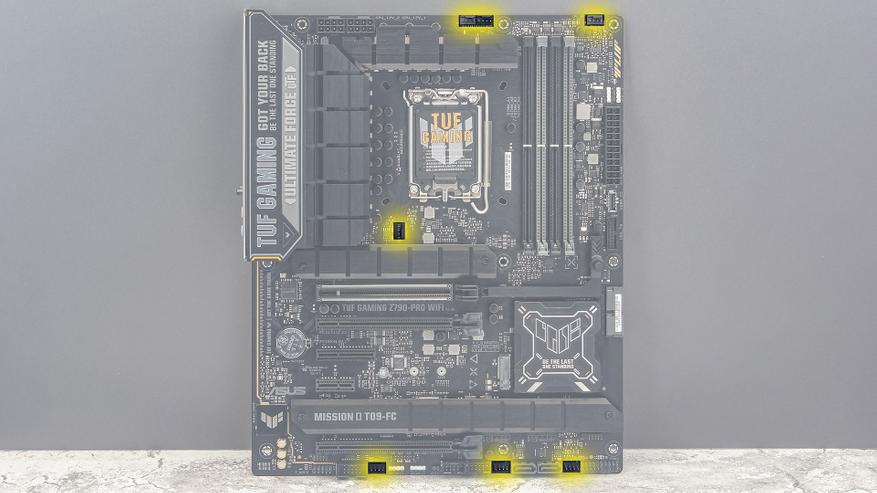 Для подключения системы охлаждения у TUF Gaming Z790-Pro WIFI предусмотрено семь 4-pin разъемов. Их расположение вполне удачно. Во всяком случае для корпусов с традиционной компоновкой.