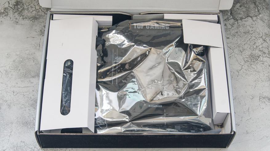 Сама плата помещена в антистатический пакет и зафиксирована внутри коробки картонной вставкой. Под ней разместился комплект поставки