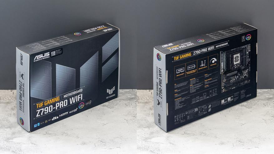 Поставляется ASUS TUF Gaming Z790-Pro WIFI в коробке вполне привычных для полноразмерной материнской платы размеров. Полиграфия коробки полноцветная, но выдержана в серо-черных цветах, которых разбавляются надписями насыщенного желтого цвета.