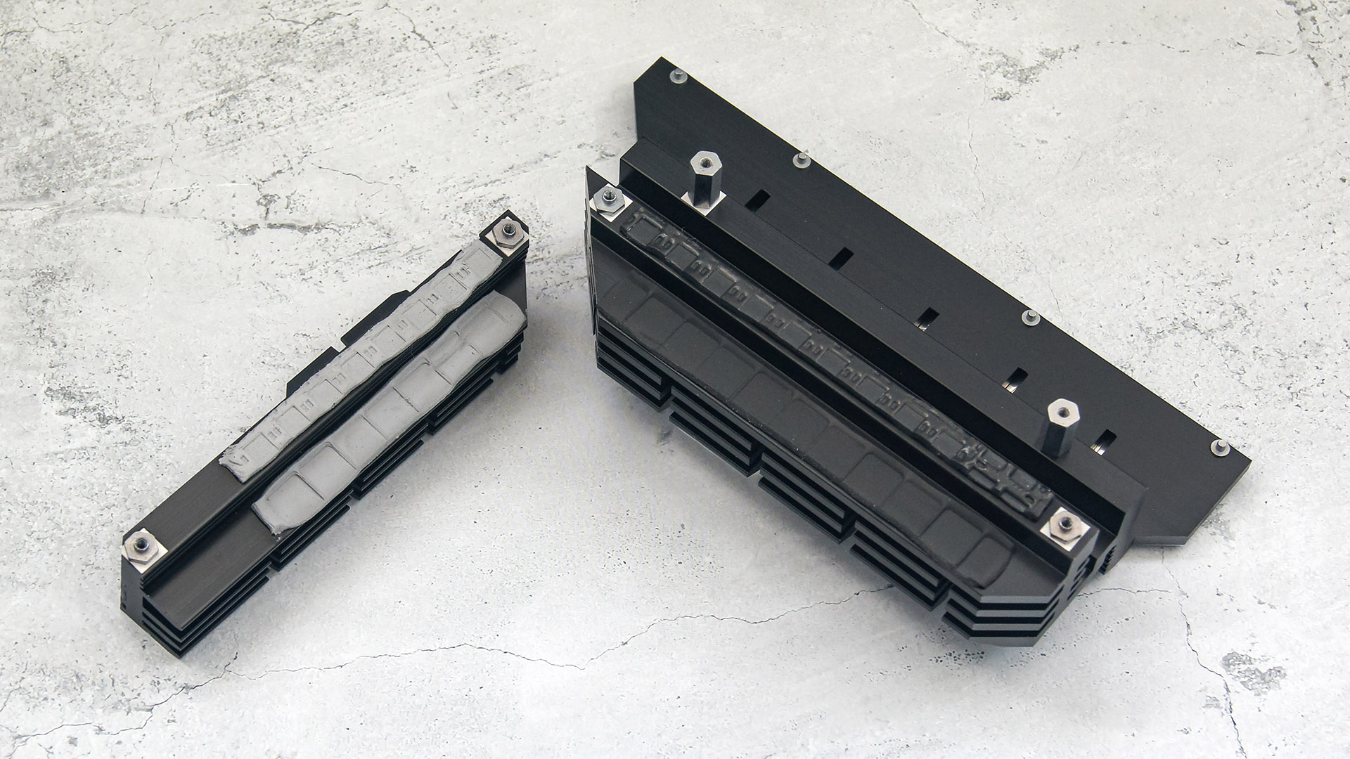 Три из четырех разъемов M.2 прикрыты штатными теплоотводами в количестве двух штук. Один из них длинный и прикрывает два самых нижних разъема, и один — верхний.