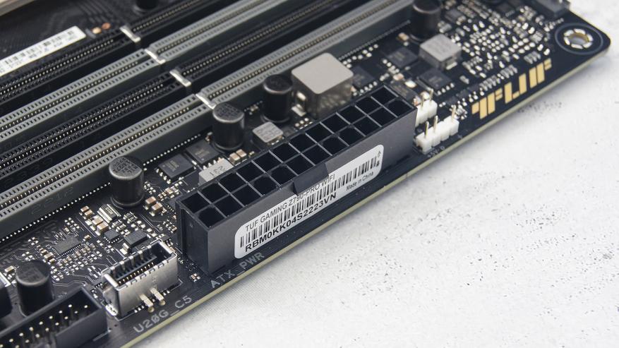 Питание платы ASUS TUF Gaming Z790-Pro WIFI подводится 24-pin коннектором и парой 8-pin коннекторами на питание процессора.