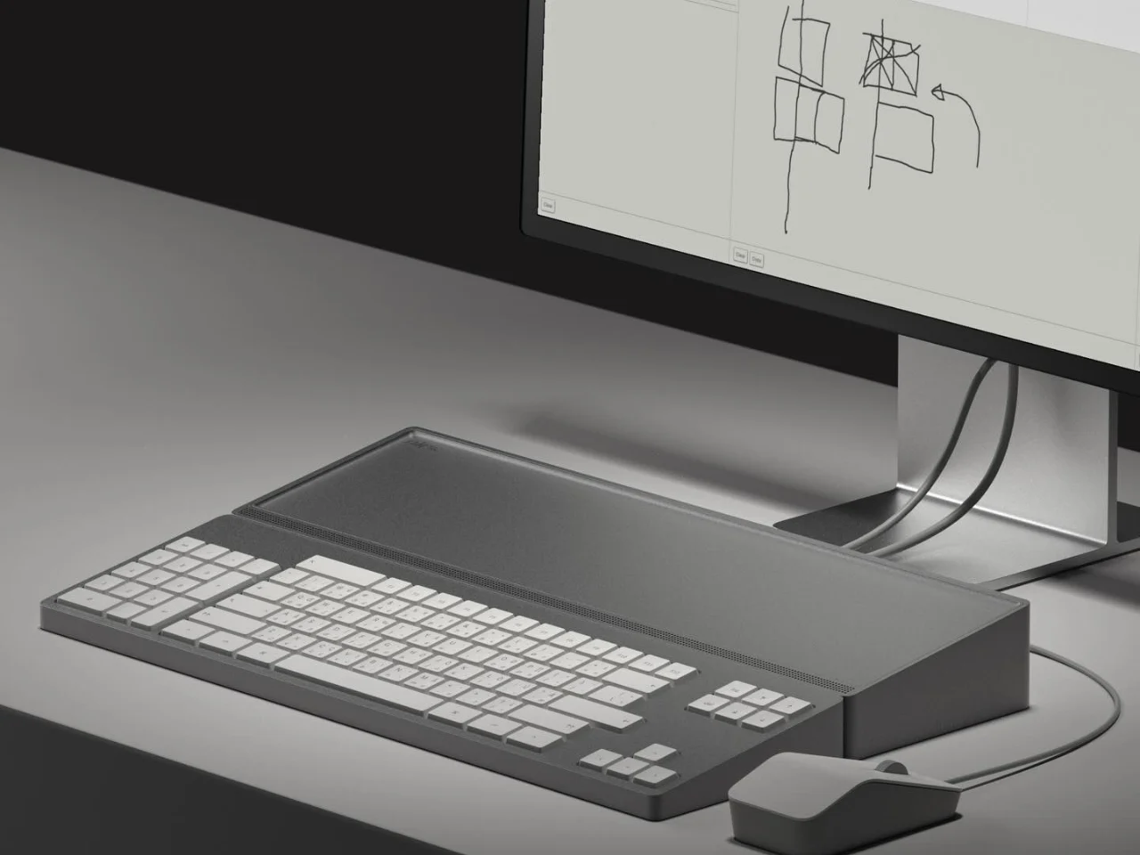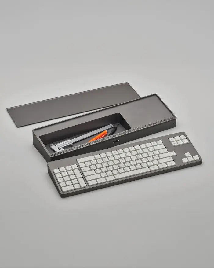 Раскладка клавиатуры организована блочным способом с разделением на функциональные группы: цифровой блок вынесен влево, клавиши навигации и функциональные клавиши сгруппированы отдельно. Компоновка основана на принципах закона Фиттса для сокращения движений рук. В комплект поставки входит проводная мышь аналогичного дизайна.