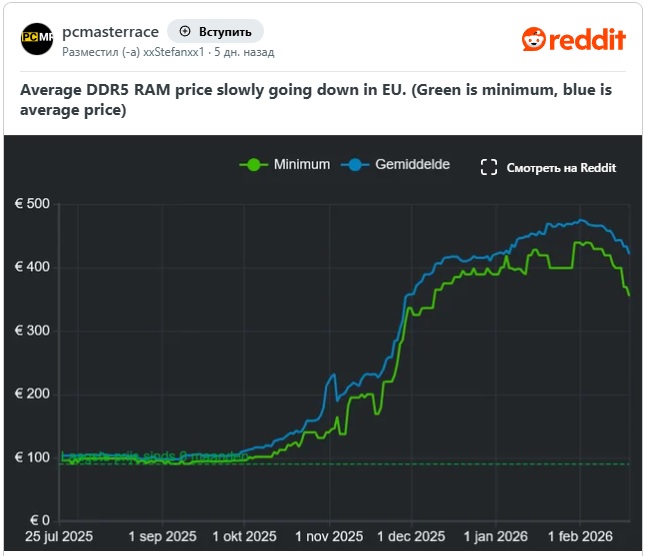 Согласно статистике, полученной через сервис мониторинга цен CamelCamelCamel для Amazon Germany, а также отчетам ресурсов 3DCenter и ComputerBase, период многократного удорожания DDR5 приостановился. Во второй половине 2025 года средняя стоимость комплекта объемом 32 ГБ выросла со 100 евро в июле до 430-550 евро к середине января 2026 года. Основной причиной повышения цен стало перепрофилирование производственных линий компаний Samsung, SK Hynix и Micron на выпуск памяти стандарта HBM для дата-центров, что вызвало сокращение поставок стандартных десктопных модулей.