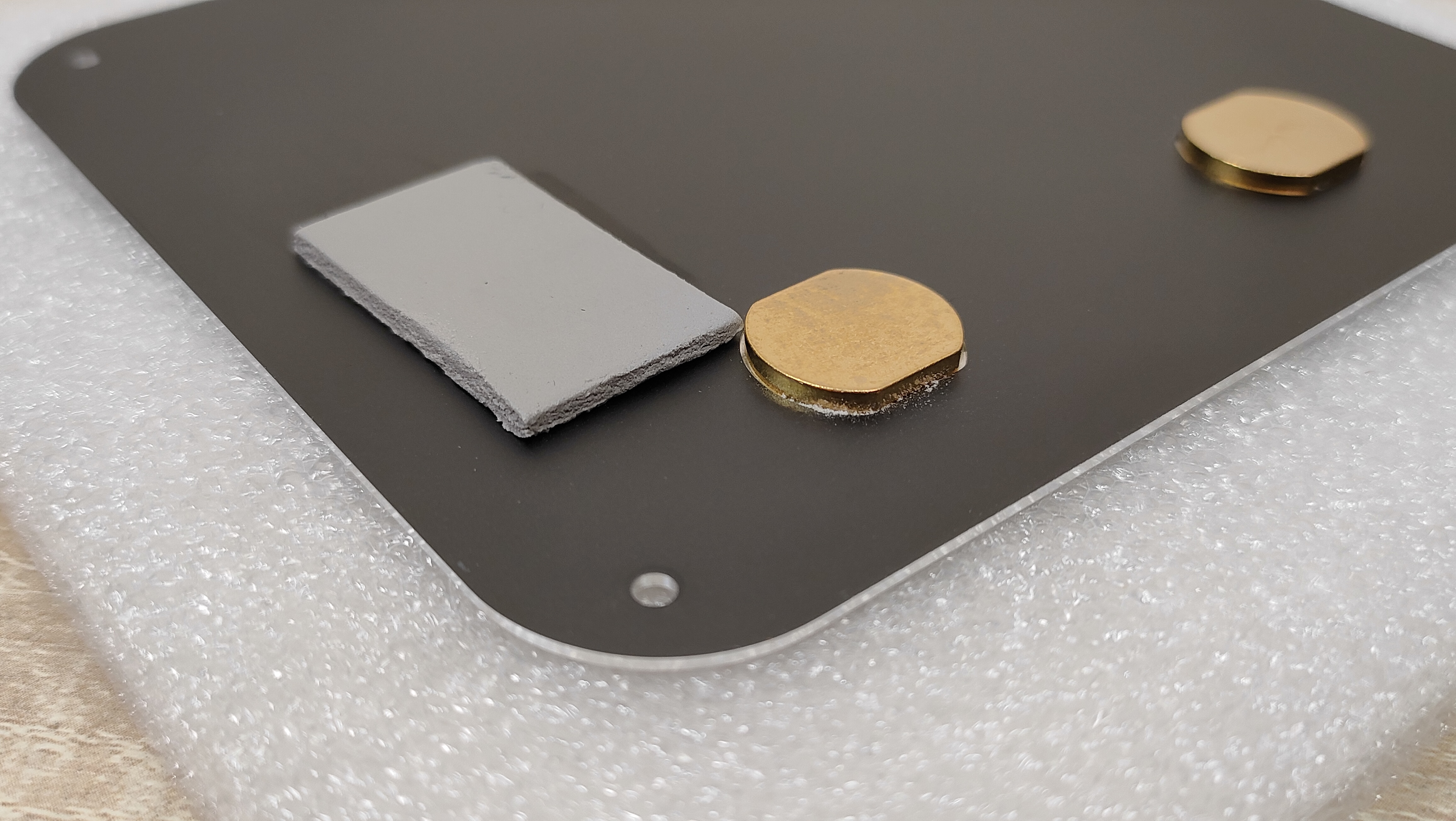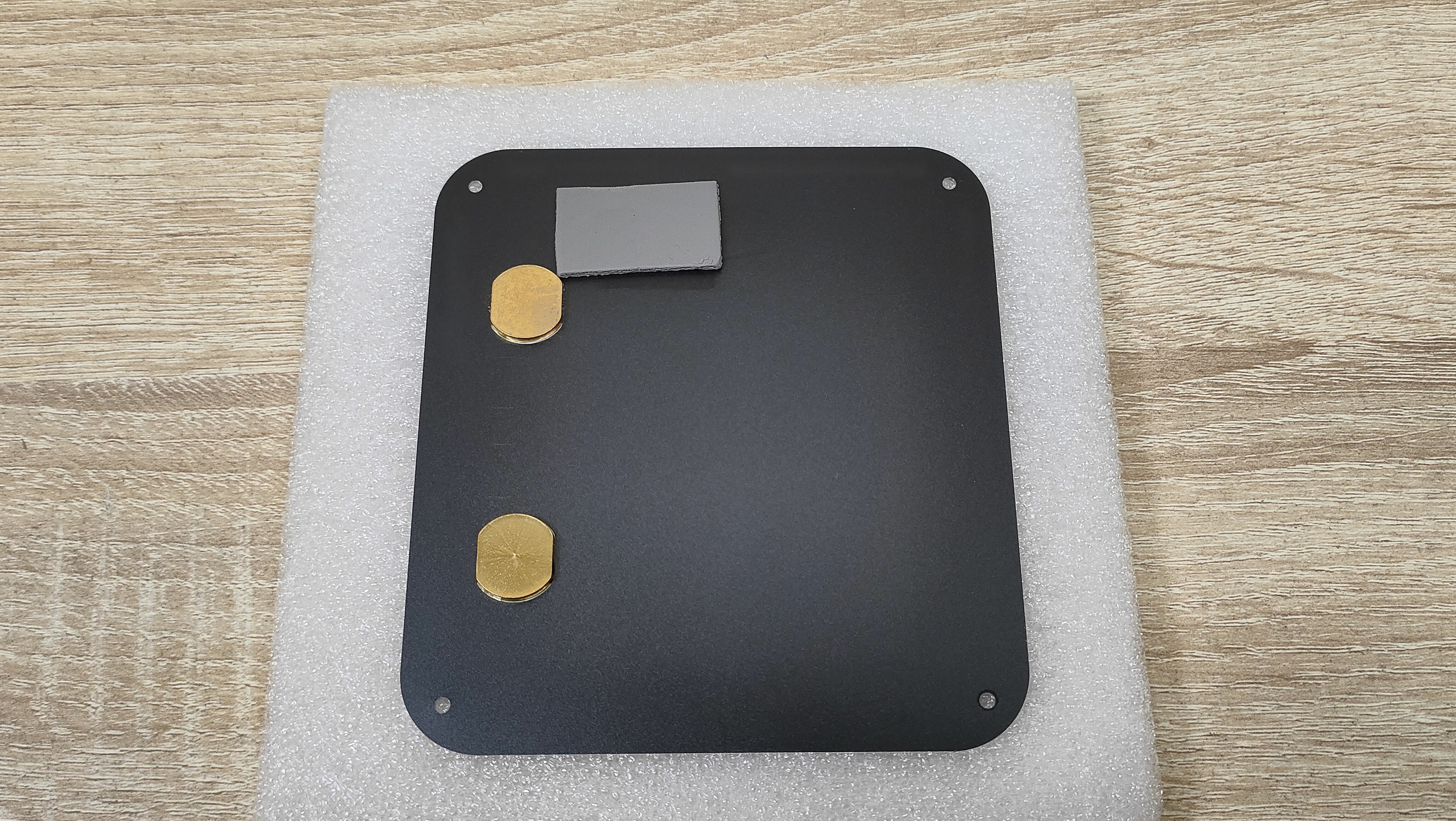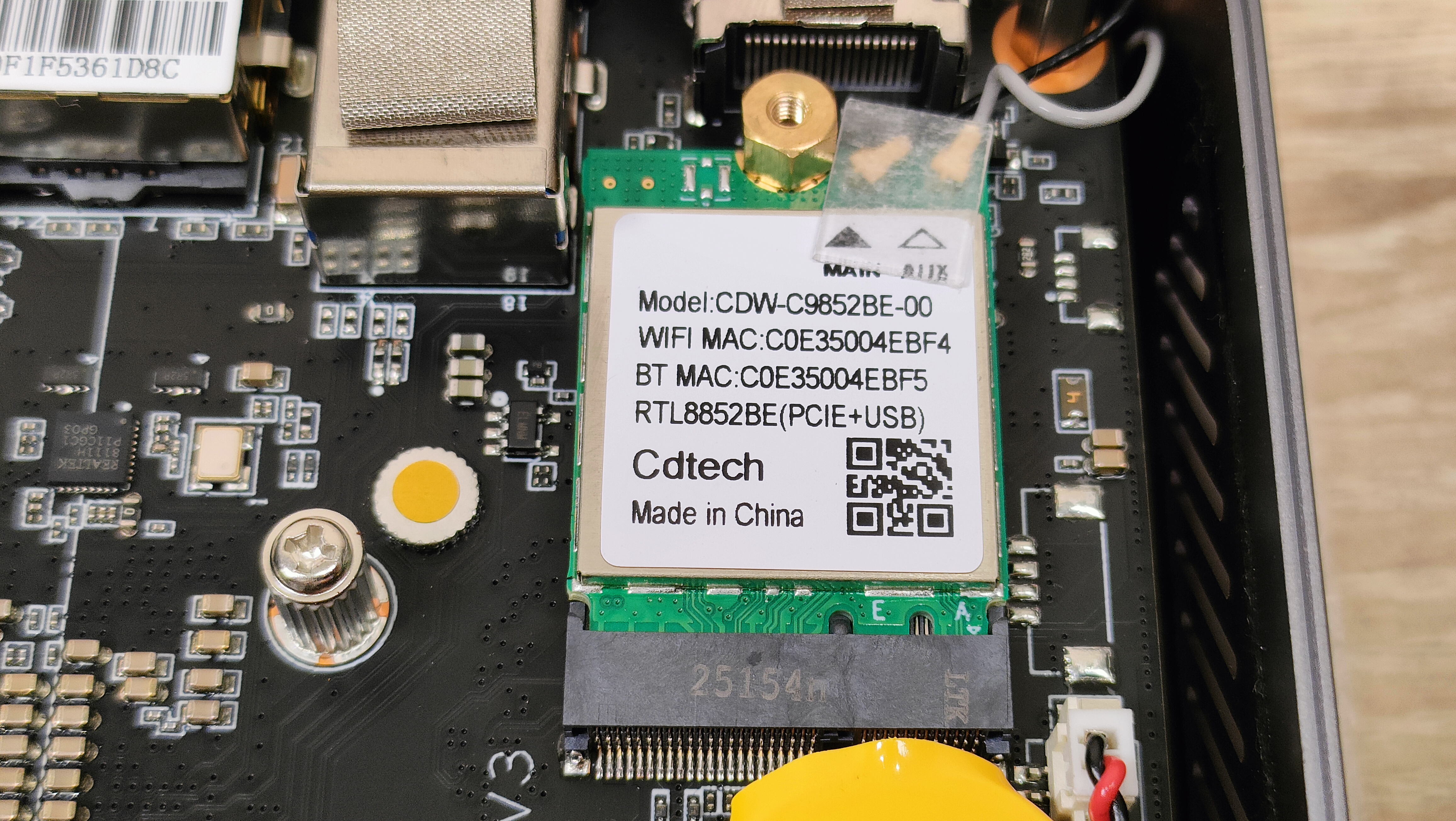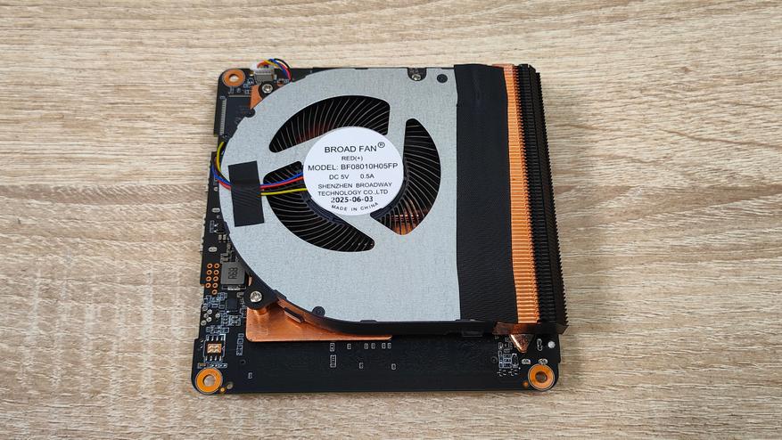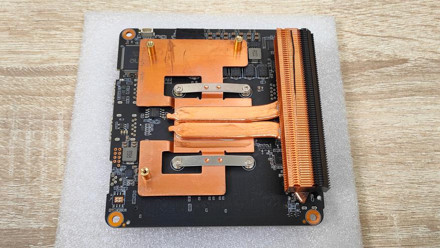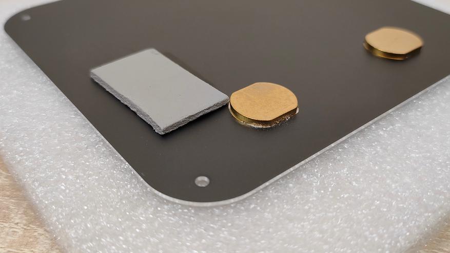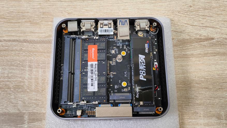 Металлические пятаки которые я увидел с внутренней стороны поддона, я сперва принял за какие-то теплосъёмники, потом включил голову покрутил поддон в руках и понял, что это впрессованные втулки для VESA-кронштейна. А вот термопрокладка — это как раз то, для чего металлический корпус полезен. Через неё передаётся тепло от SSD накопителя к поддону, а с него уже и на остальной корпус. То есть металлический корпус данного мини-ПК, играет роль радиатора для твердотельного накопителя, а значит, установив очень горячий SSD, можно просто обжигаться о корпус, но это уже проблема конкретного твердотельника, который пользователь туда установит.