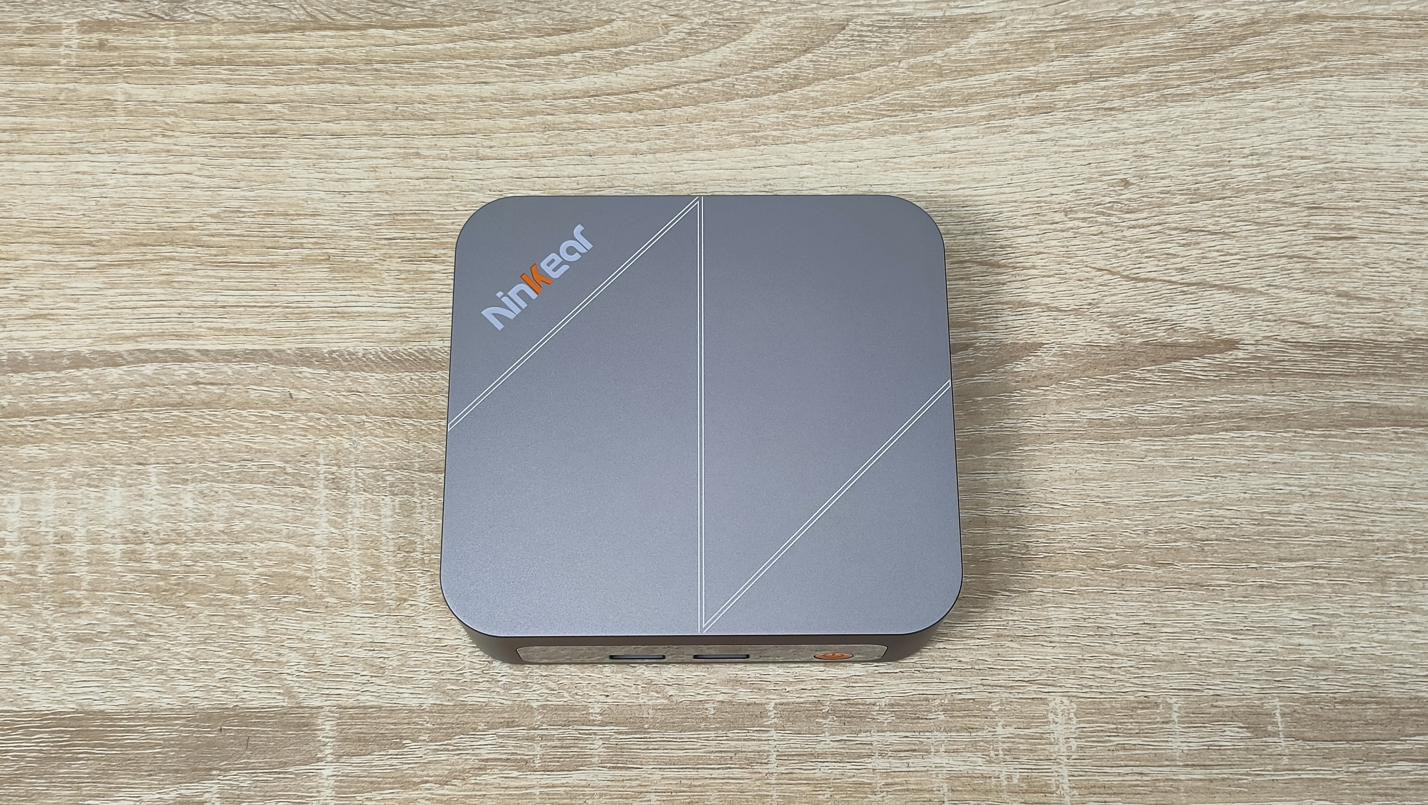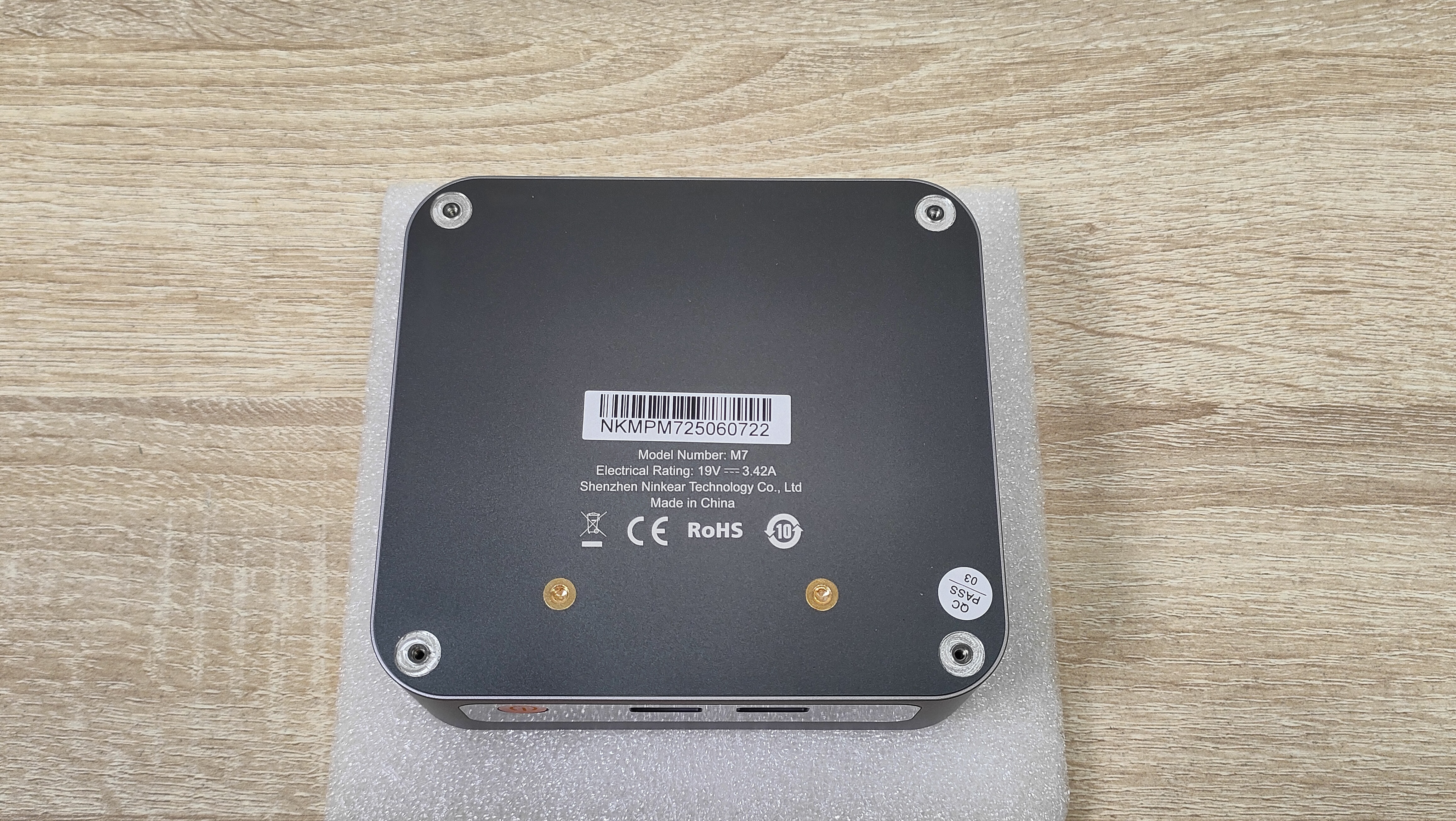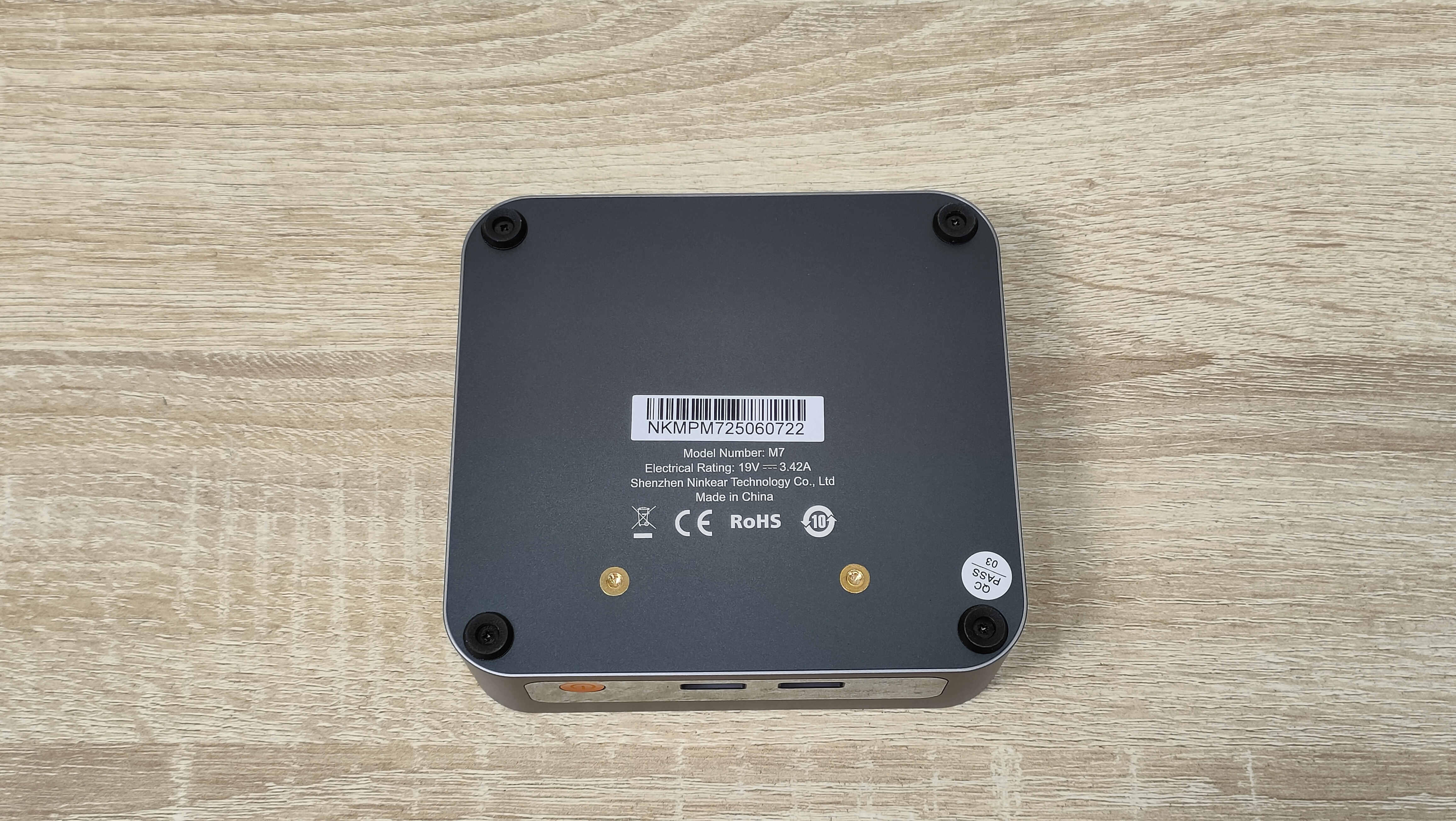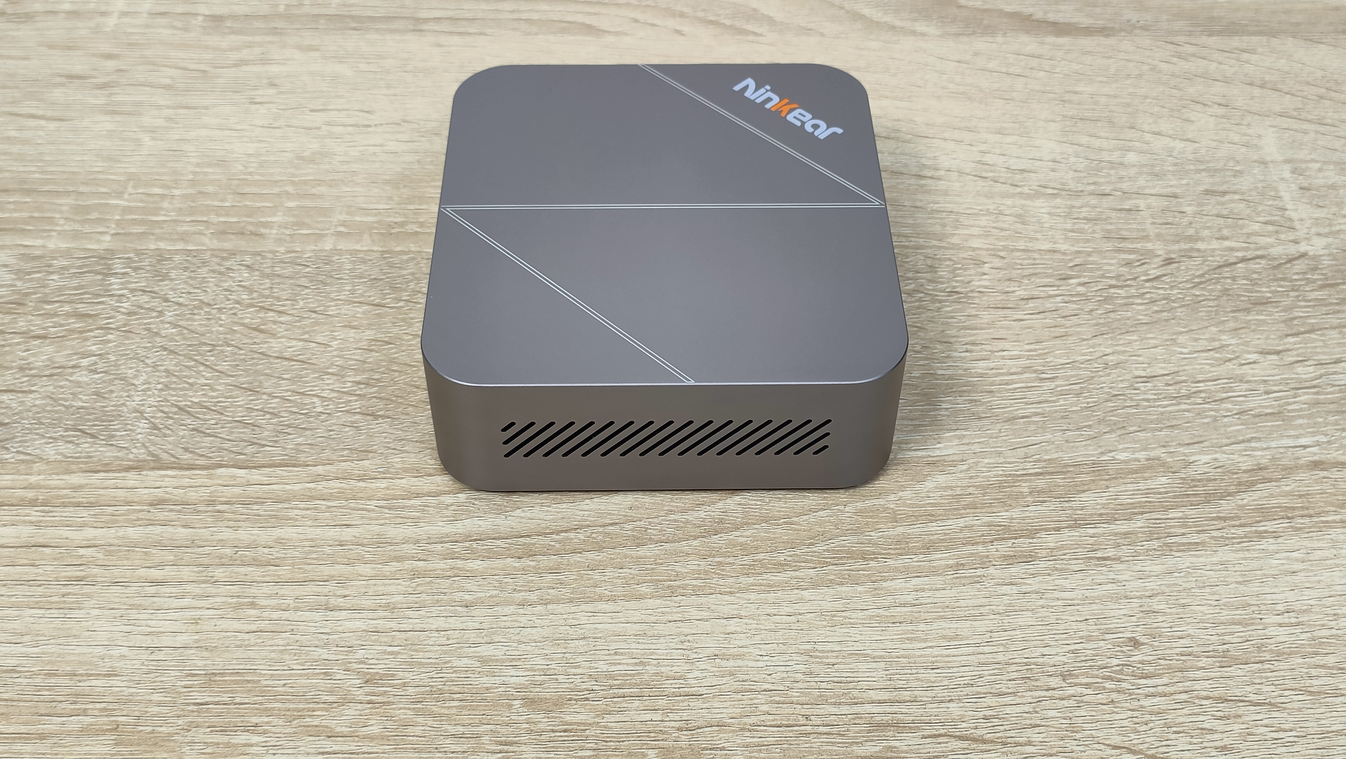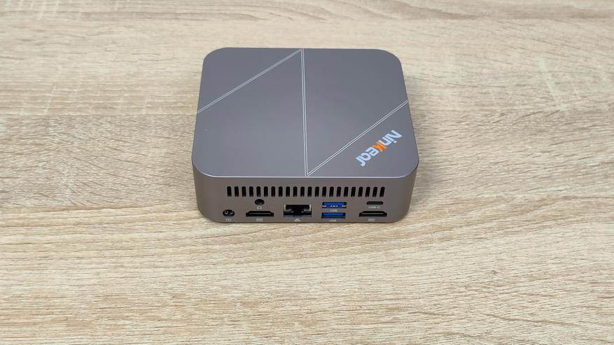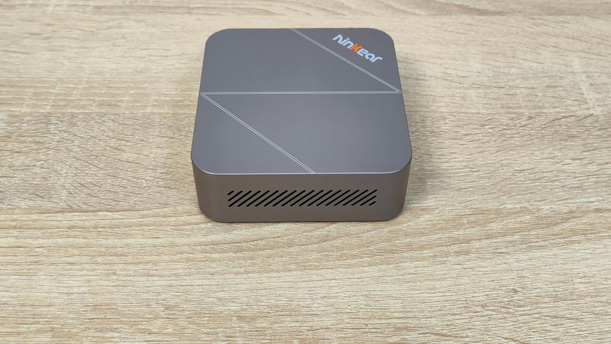 Сверху у компьютера есть логотип бренда, а также во всю крышку нанесена большая буква N по диагонали, её можно было увидеть на других мини-ПК данного бренда последнего времени. На дне всё строго, только лишь маленькие силиконовые упоры и надпись с базовой информацией. Высота этих ножек не так критична, так как забор воздуха не идёт со дна, а значит, нет смысла делать там огромную щель. Это больше важно для тех компьютеров, у которых есть хоть какой-то забор воздуха оттуда.