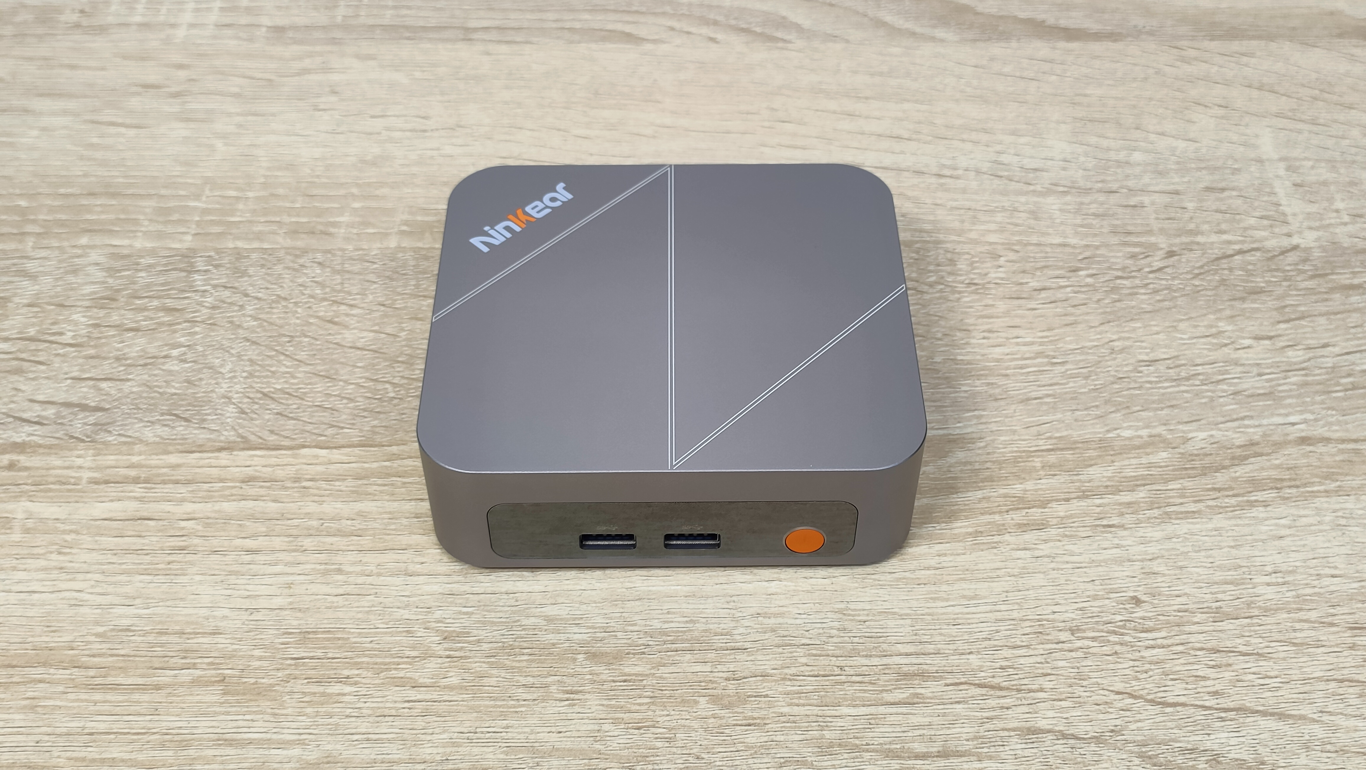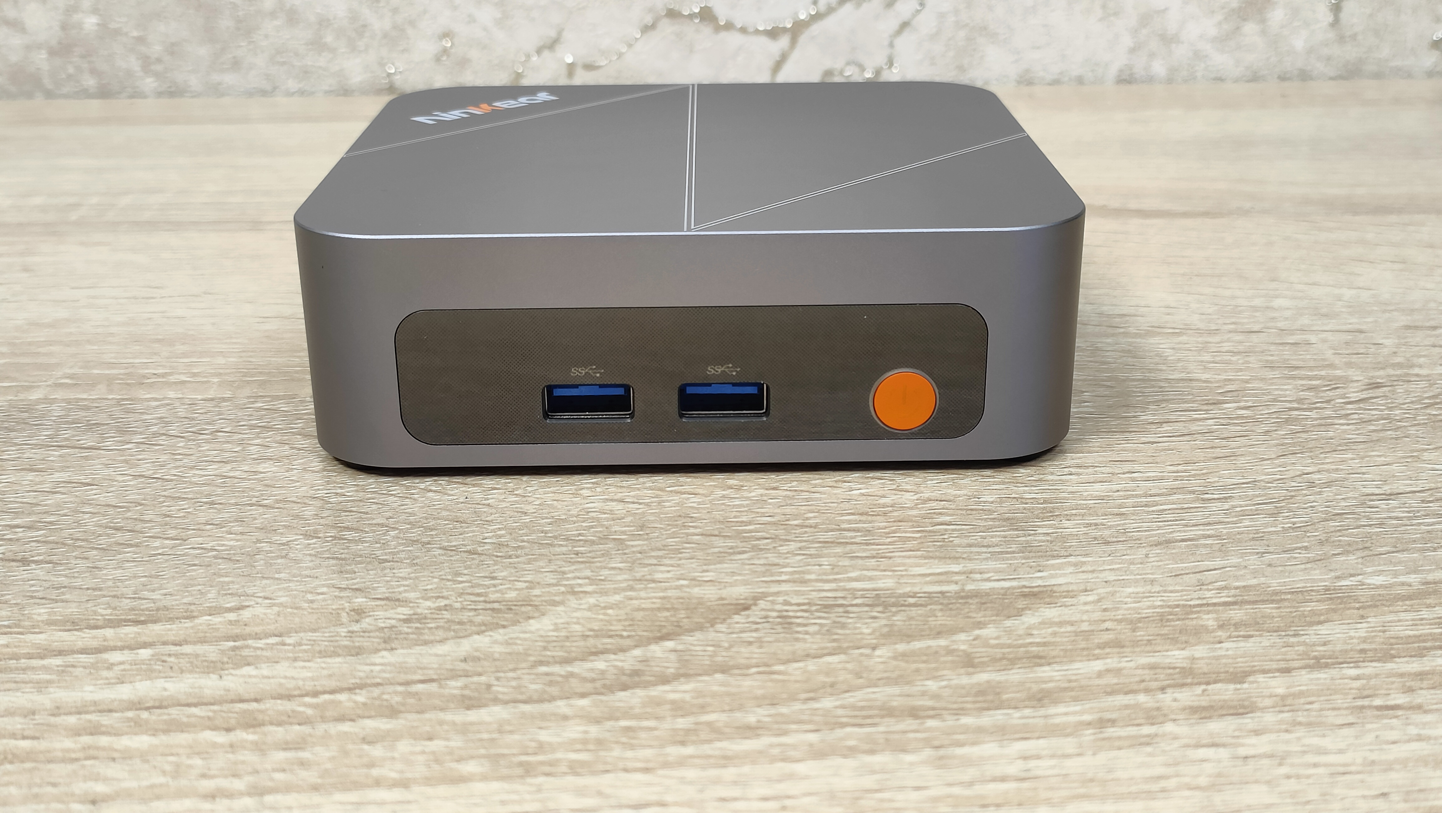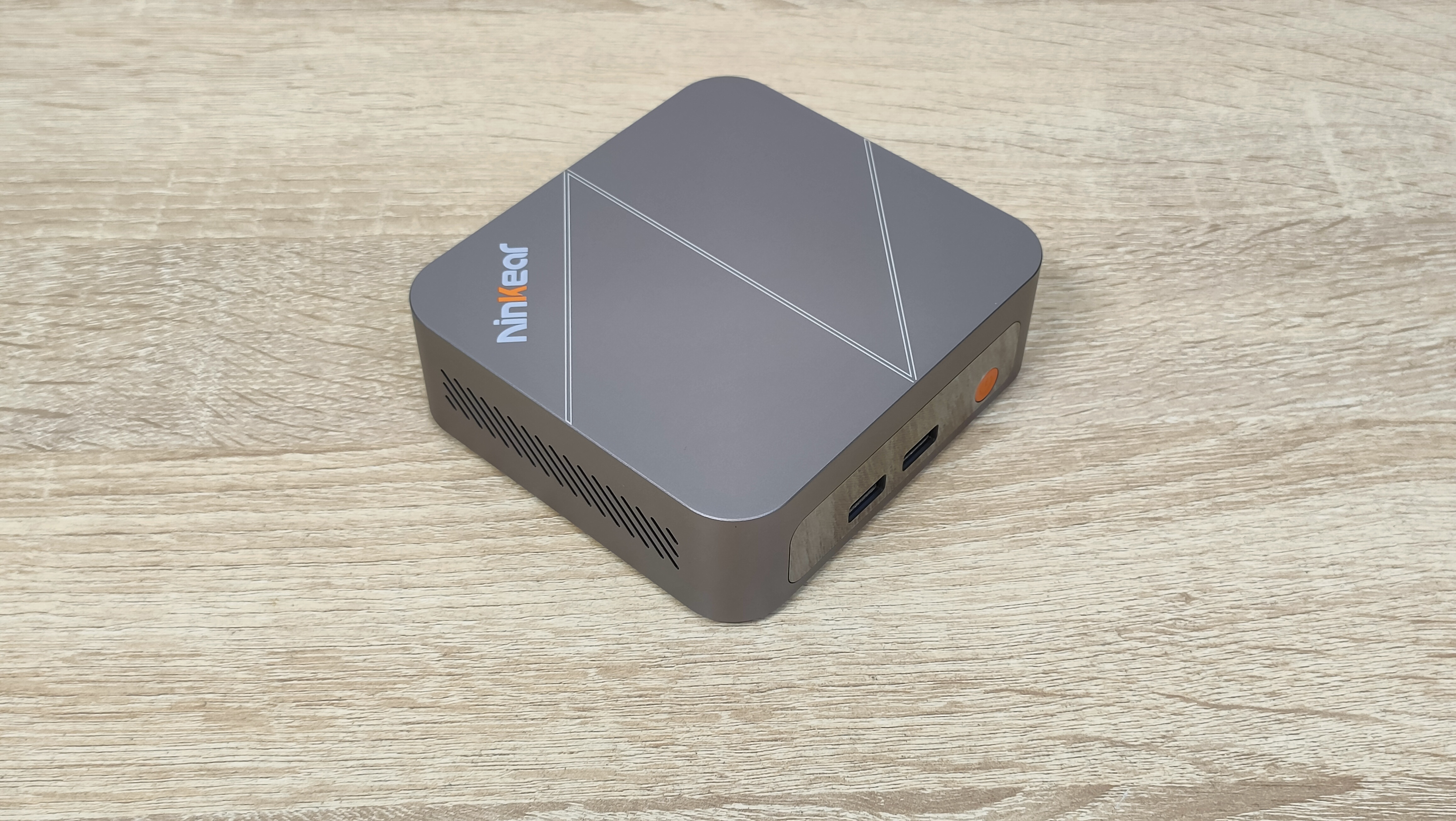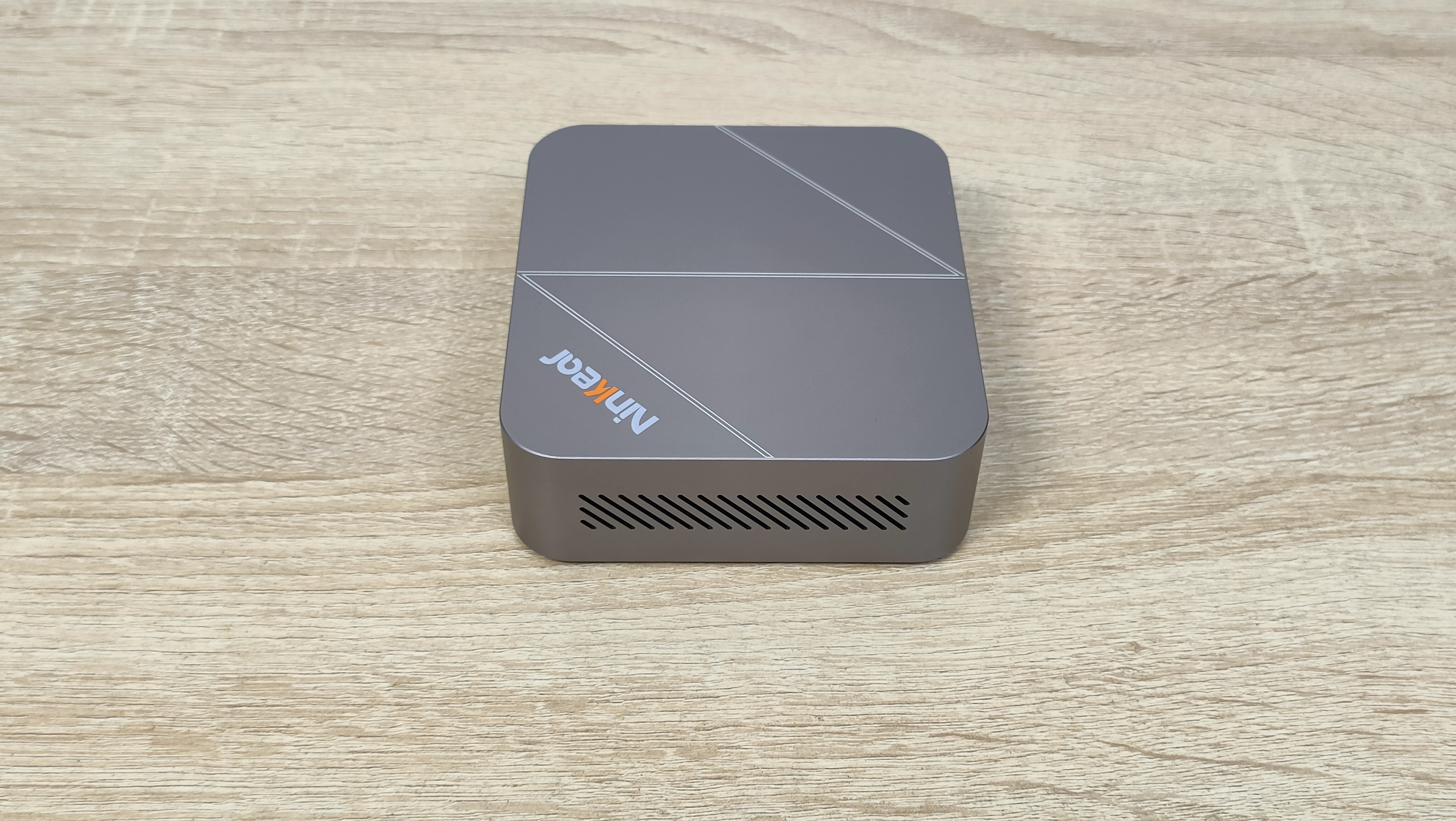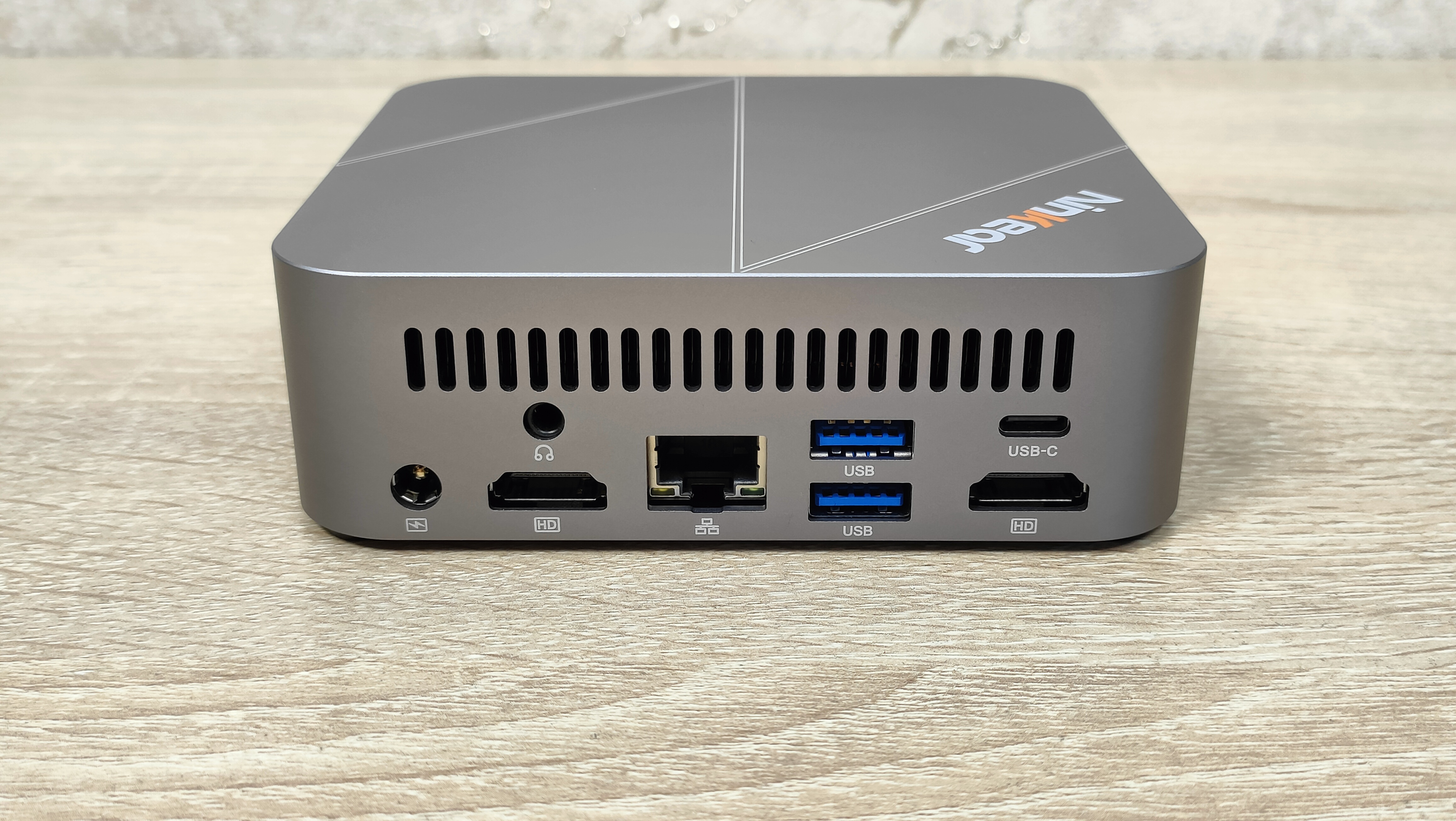 Сверху у компьютера есть логотип бренда, а также во всю крышку нанесена большая буква N по диагонали, её можно было увидеть на других мини-ПК данного бренда последнего времени. На дне всё строго, только лишь маленькие силиконовые упоры и надпись с базовой информацией. Высота этих ножек не так критична, так как забор воздуха не идёт со дна, а значит, нет смысла делать там огромную щель. Это больше важно для тех компьютеров, у которых есть хоть какой-то забор воздуха оттуда.