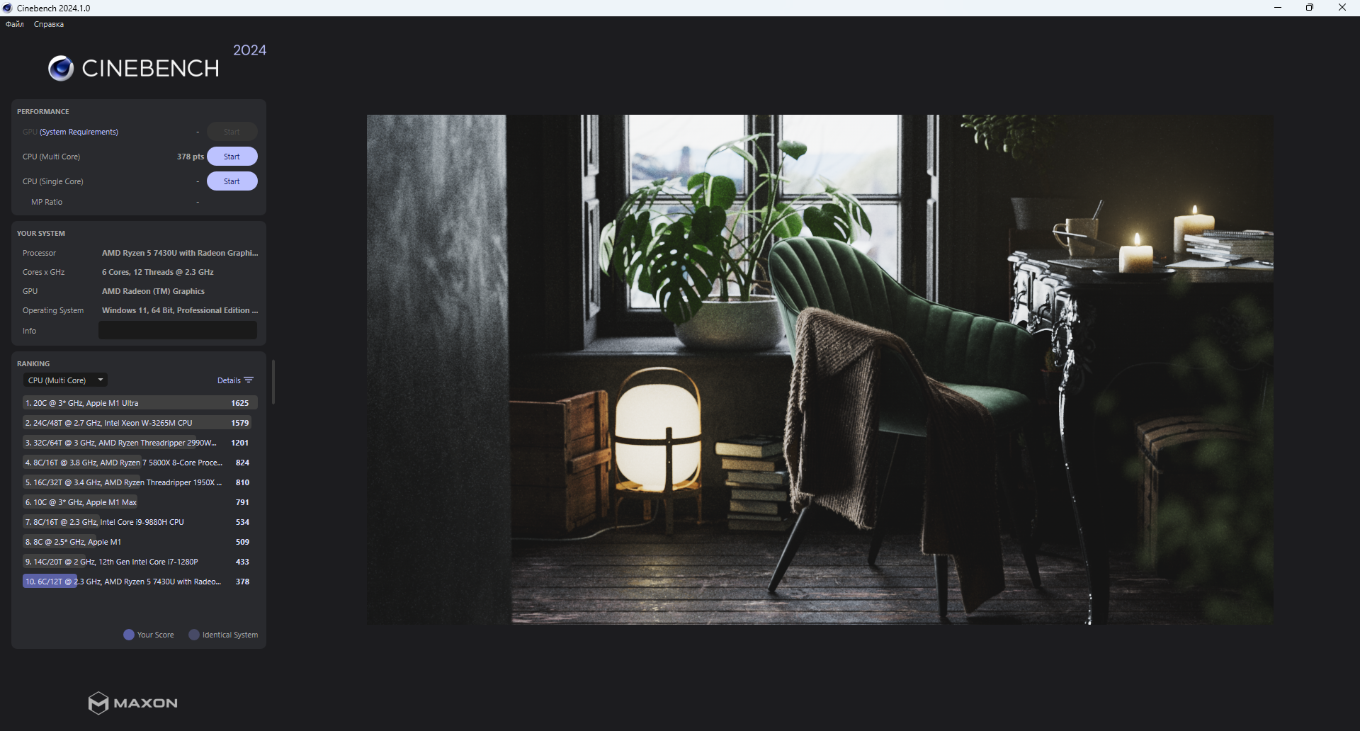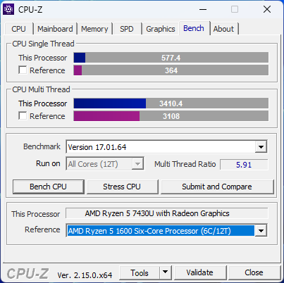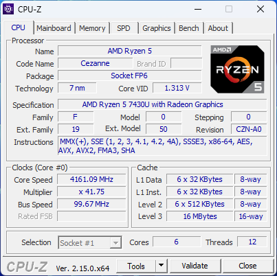 Ryzen 5 7430U основан на ядрах ZEN 3 в количестве 6 штук, каждое из которых, может обрабатывать по два потока. Частотная формула: от 2.3 ГГц до 4.3 ГГц, теплопакет, естественно, настраивается, минимальное его значение обычно в районе 15 Вт, максимальное — как вендор захочет, но редко поднимают его до высоких значений, так как это энергоэффективный процессор и мало кто относится к нему как-то особенно, обычно указывают какой-то стандартный пакет и всё. Память естественно DDR4, в данном случае одна планка на 16 ГБ с частотой 3.200 МГц. В качестве эксперимента, я попробую добавить второю планку с такой же частотой и посмотреть, какие результаты будут в некоторых тестах.