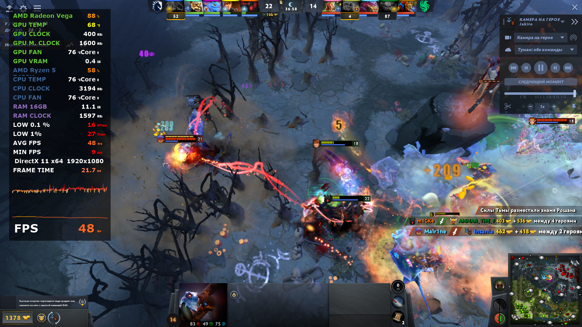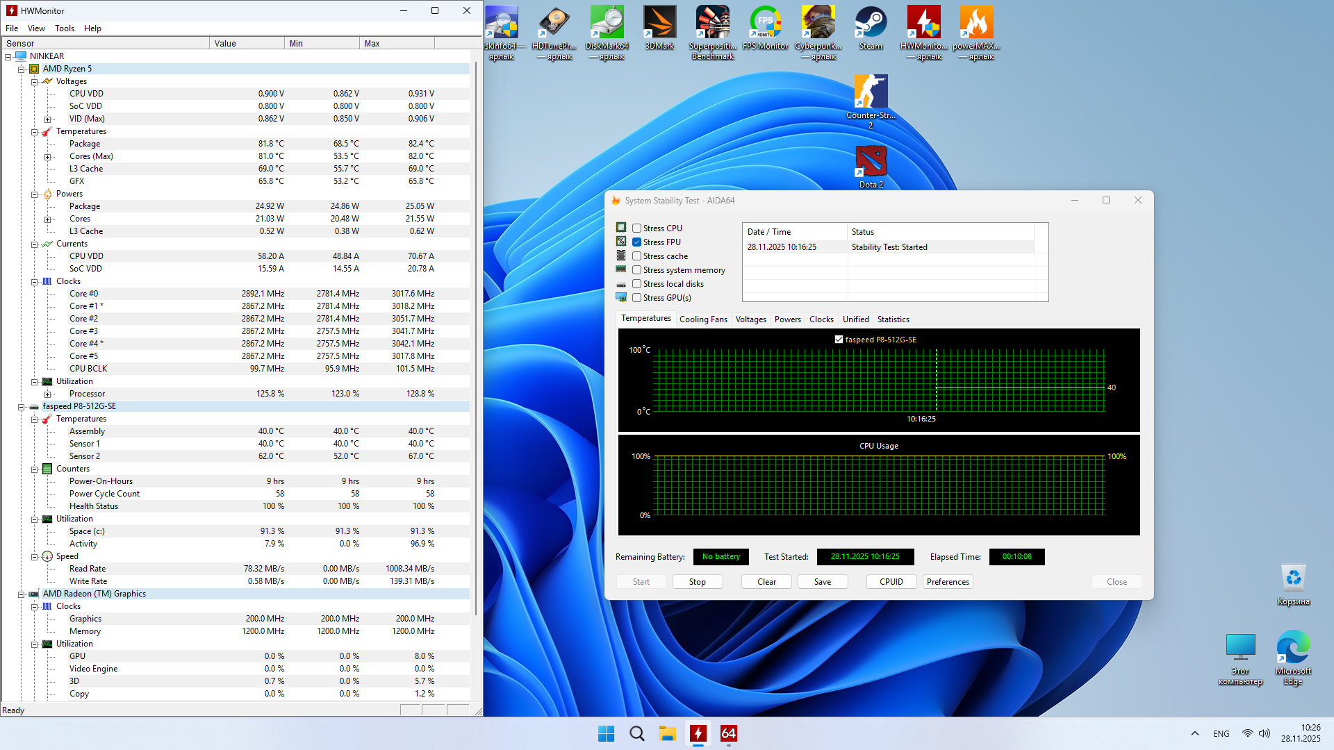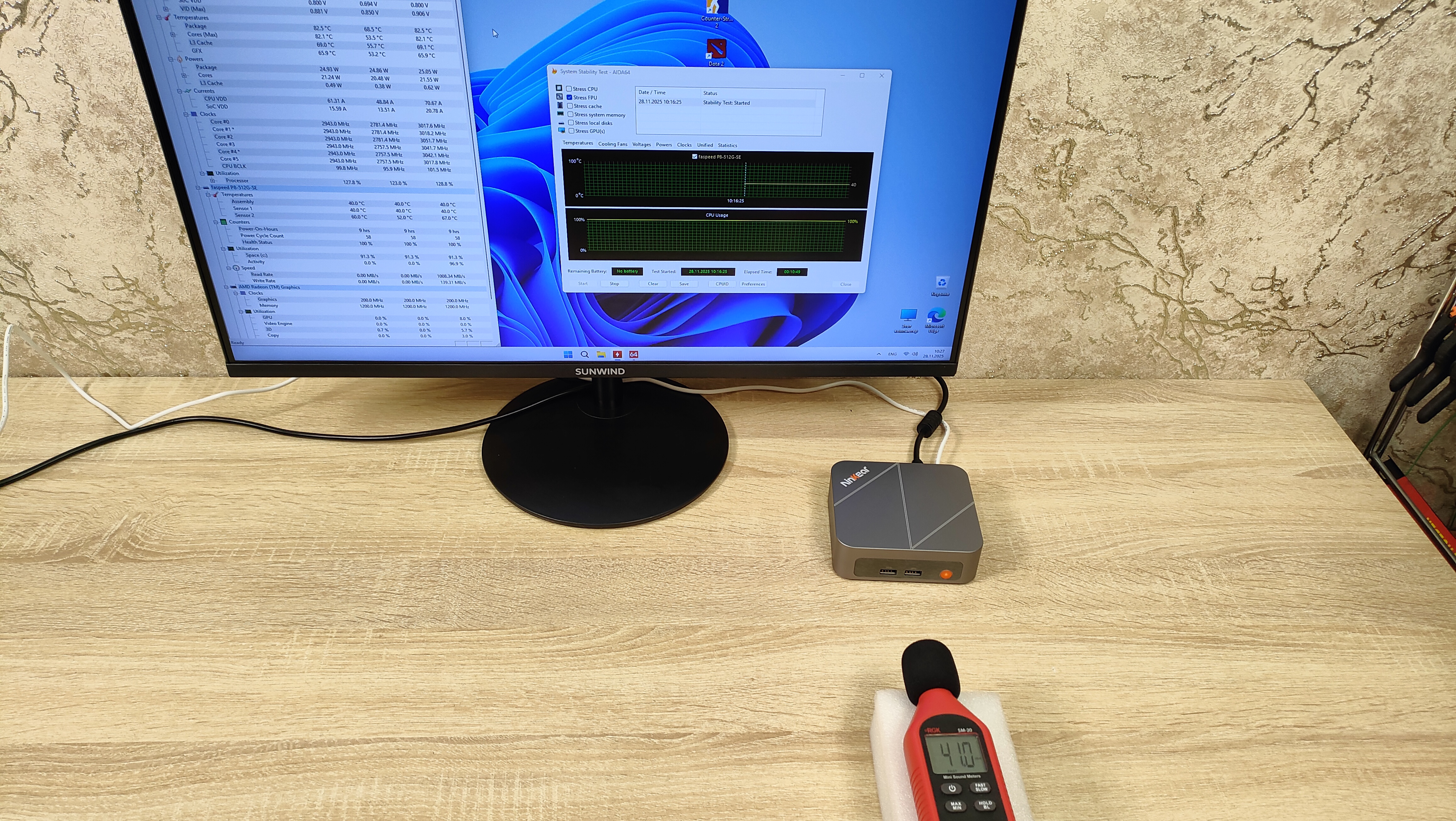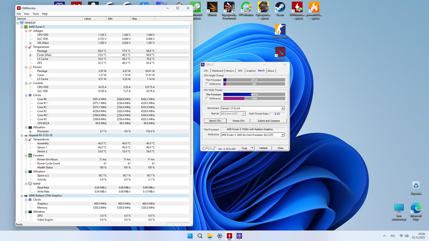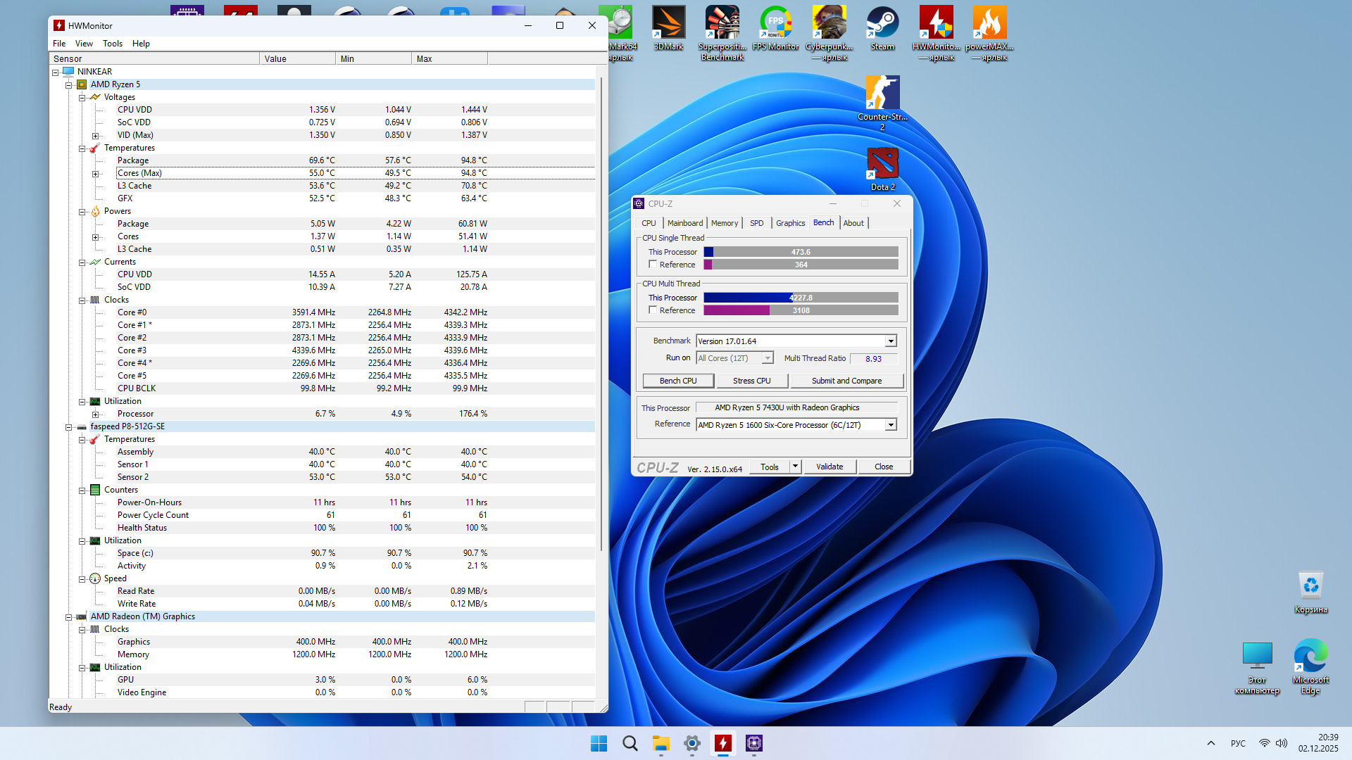 Собственно, чуда не случилось, но я его и не ожидал. Как всегда, я мини-ПК тестирую в максимально возможном режиме потребления, которые можно только установить в BIOS и так далее, но здесь стандартное, но об этом далее. Поэтому то, что видно на скриншотах — это ожидаемый уровень того, что есть из коробки, то есть память здесь работает в одноканальном режиме, нагрев такой какой есть. Список игр очень сильно ограничен, так как хоть сколько-то тяжёлой игра сразу роняет процессор на пол и топчется на нём. CS2 капризная игра, периодически появляются дикие лаги, которые ставят крест на игре, DOTA 2 себя так не ведёт, но в замесах всё же тяжело процессору. Естественно, я попробую установить вторую планку памяти и посмотреть насколько выправится ситуация.