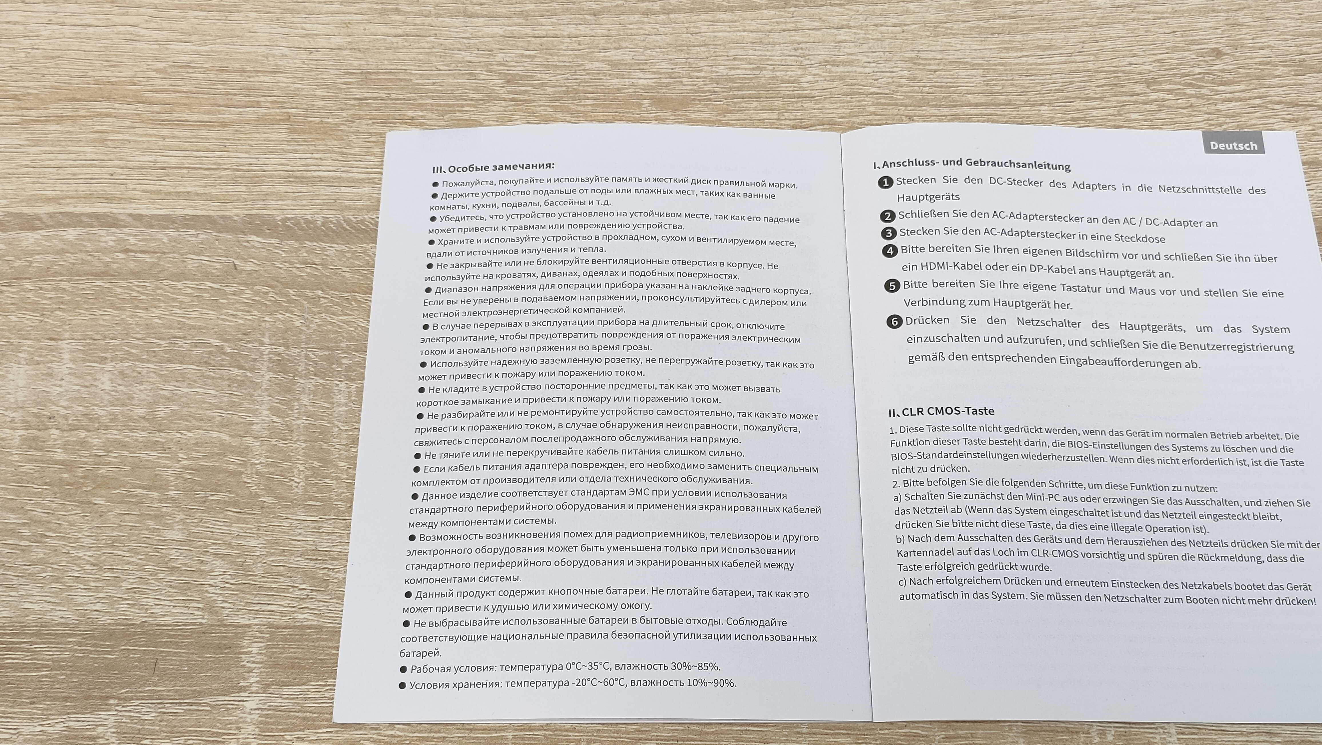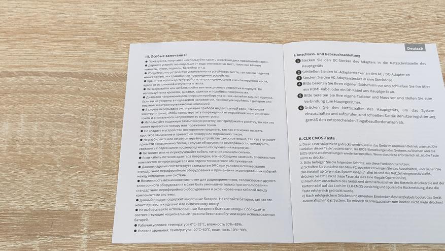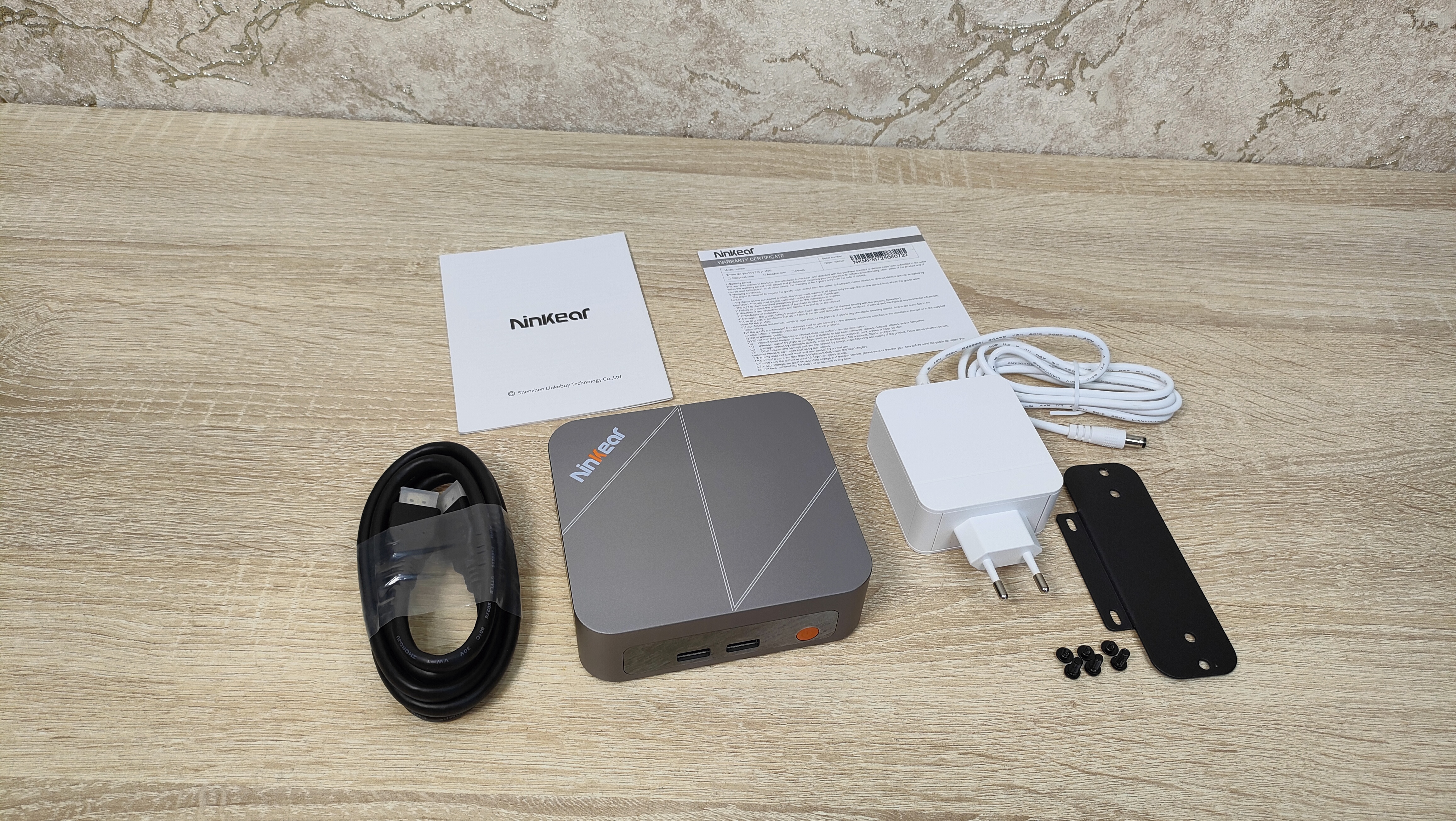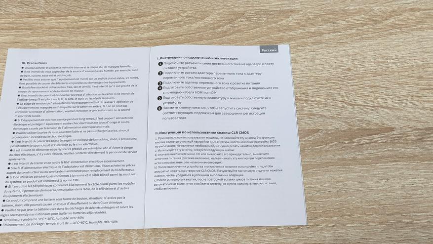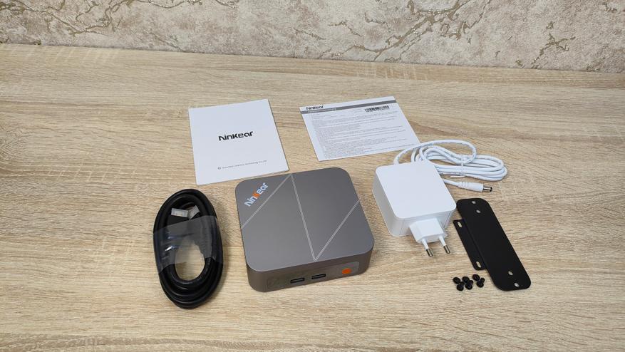 Никакого брендирования на ней нет, есть только наклейка с комплектацией и моделью на одном из торцов. В комплект поставки входит следующее: мини-ПК, сетевой адаптер питания, HDMI кабель, VESA кронштейн с набором винтов, гарантийный талон, руководство пользователя. Набор стандартный, хотя, некоторые умудряются не положить HDMI кабель.