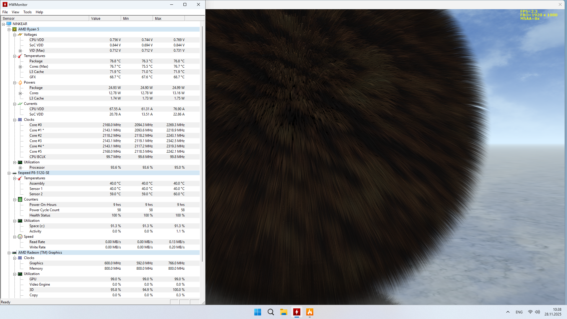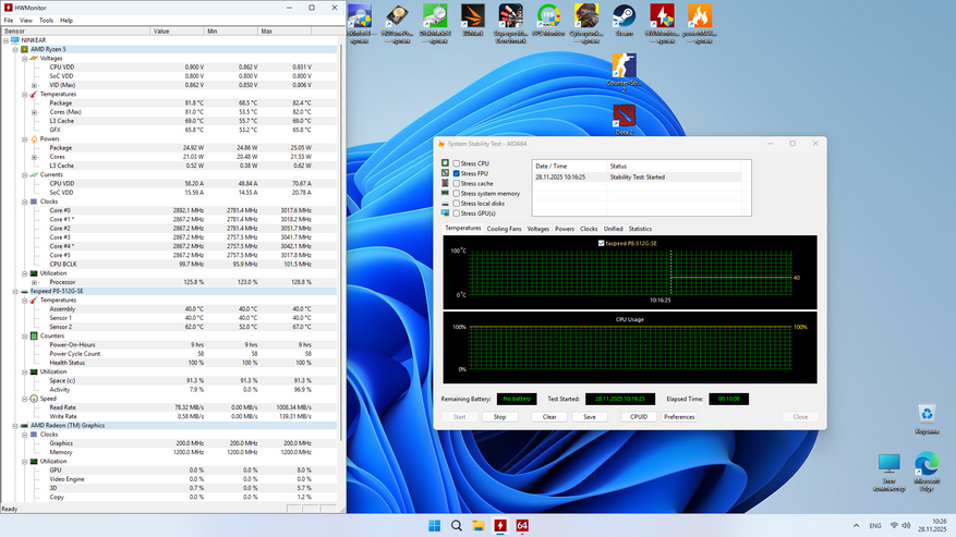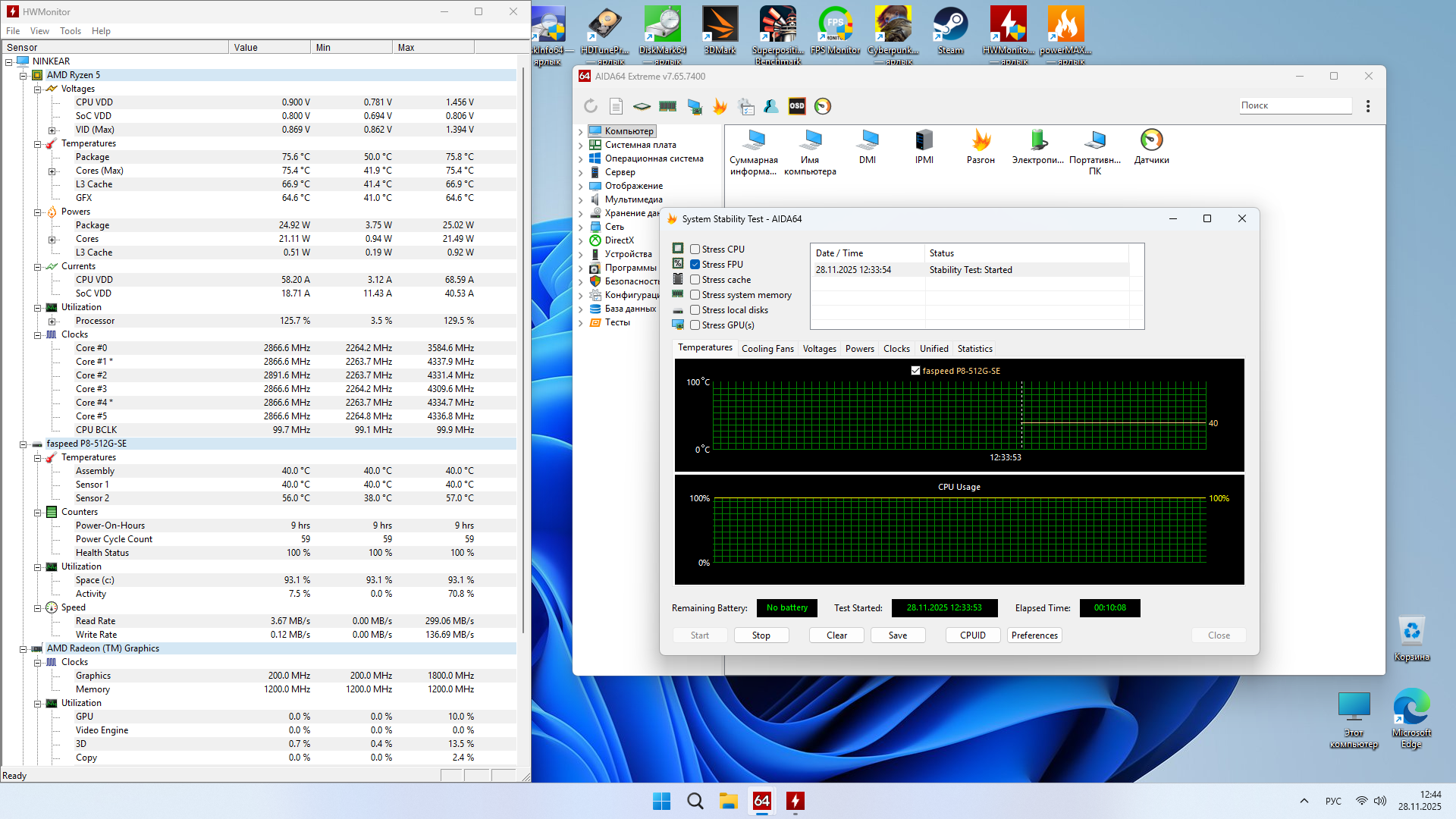 Первый скриншот, как всегда, получен после всех тестов ДО стрессовой синтетики. Видно, что прыжками и с импульсной нагрузкой, процессор смог прогреться до 95 градусов (паспортный максимум), что очень даже немало при 27 Вт пиковой нагрузки, проблема или теплоёмкости, или теплоотведения, пока вопрос открытый. Стрессовая нагрузка в течение 10 минут оказалось более мягкой, но при этом гораздо менее продолжительный по времени, и глядя на нагрев во время стресса синтетического, можно сказать, что, скорее всего, это вопрос теплоёмкости и отведение тепла, то есть система охлаждения успевает снять тепло, которое поступает от процессора, а вот рассеять его не совсем удаётся.