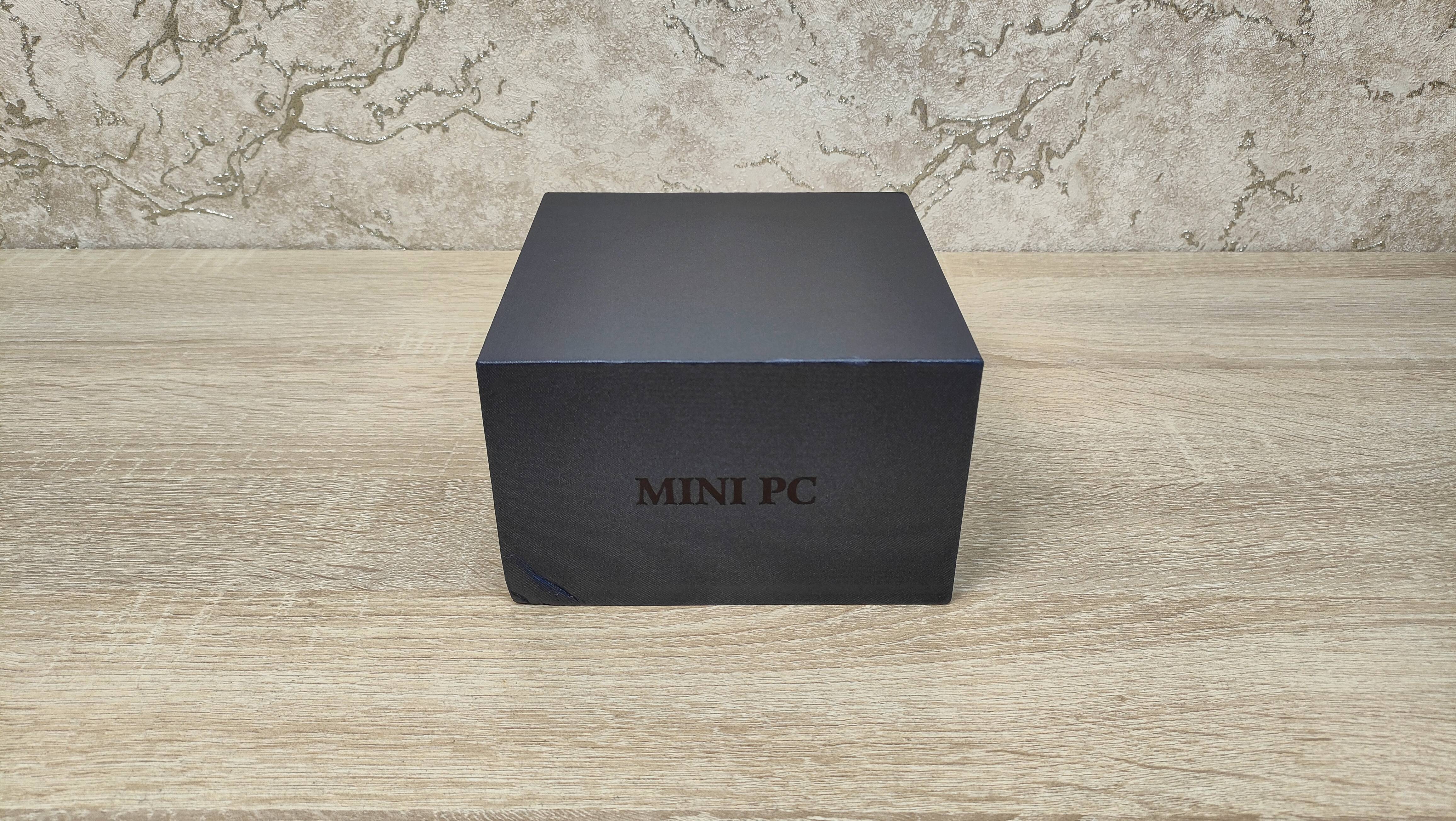 Небольшая строгая чёрная картонная коробка, именно такая упаковка у данного мини ПК.