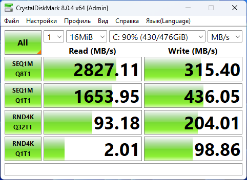 В качестве накопителя используется PCIe твердотельный накопитель, показывающий типичные бюджетные результаты, однако, радует тот факт, что производитель отошёл от ещё более простых SATA решений, за которые не ругал их только самый ленивый. Низкий результат в CDM, скорее всего, из-за 90% занятости.