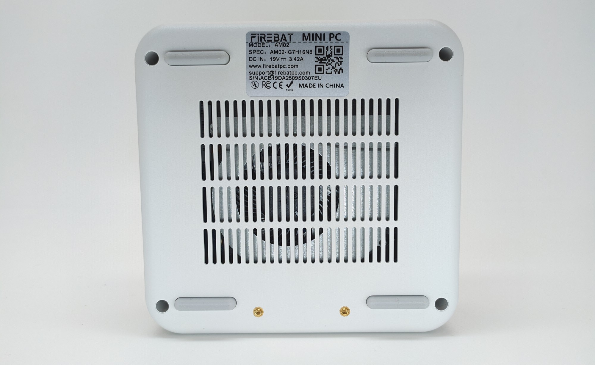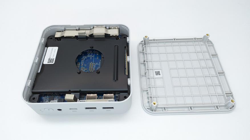 Также у нас есть два разъема с резьбой для установки крепления, с помощью которого можно будет прикрепить мини-ПК сзади на монитор. Крепление со всеми болтиками в комплект положили. Есть наклейка, на которой указана модель устройства, ссылка на сайт, информация по питанию и серийный номер, который продублирован в QR-коде.
