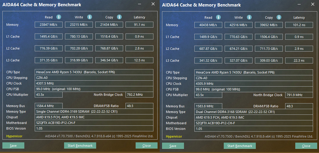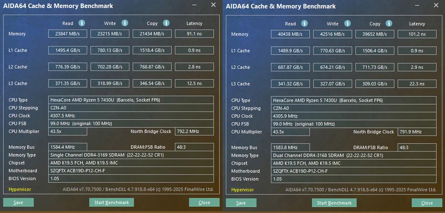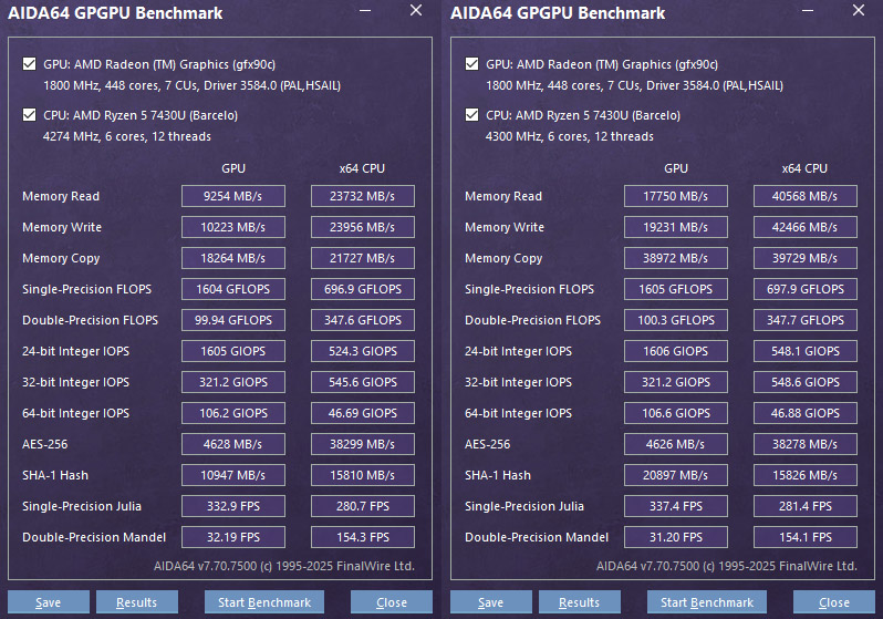 Далее тесты будут как с одной стоковой планкой оперативной памяти, так и с двумя. На всякий случай отмечу, что если вы добавите более медленную память, то стоковая память опустится по производительности до медленной. Для начала я сделал тесты в CPU-Z и тест памяти в AIDA64. В CPU-Z дополнительная память никак не сказалась на производительности процессора, а AIDA64 показала прирост в скорости чтения и записи, но при этом немного увеличились задержки. В бенчмарке AIDA64 для видеокарты также увеличилась скорость памяти.