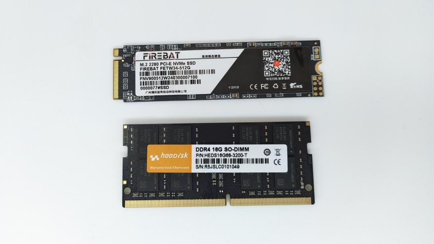 Под SSD расположился M.2 модуль беспроводной связи. Оперативная память фирмы Hoodisk мне неизвестна. Никакой информации по таймингам и вольтажу на ней не указано. Плашка SSD выпущена под брендом Firebat, но это обычная практика для OEM-комплектующих.