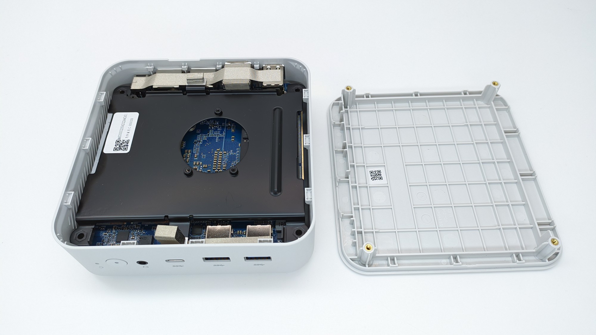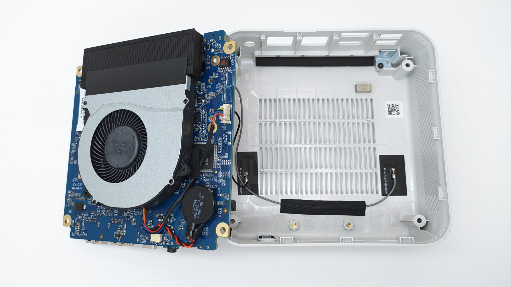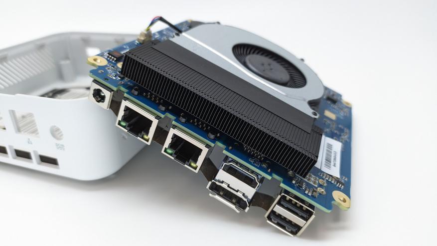 Для активного охлаждения воздух забирается снизу. Благодаря четырем резиновым ножкам получается зазор, через который вентилятор всасывает воздух. Но, если честно, мне показалось, что 3,5 мм зазора маловато, и я использовал AM02, поставив его набок, и подложил под один край дощечку, чтобы пассивное охлаждение тоже работало и охлаждало оперативную память и SSD. А они греются, и довольно ощутимо, это я выяснил при разборе девайса. По факту же я сделал два 15-минутных теста на боку и на, как обычно, на ножках, и разница в температурах была в пределах погрешности — 1-1,5 градуса по ядрам. Это значит, что забора воздуха снизу вполне хватает, и пусть себе стоит на ножках.