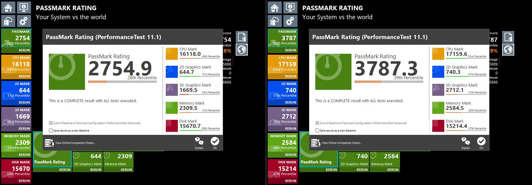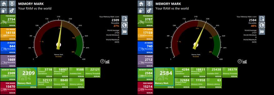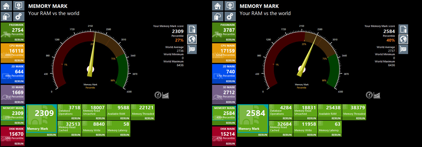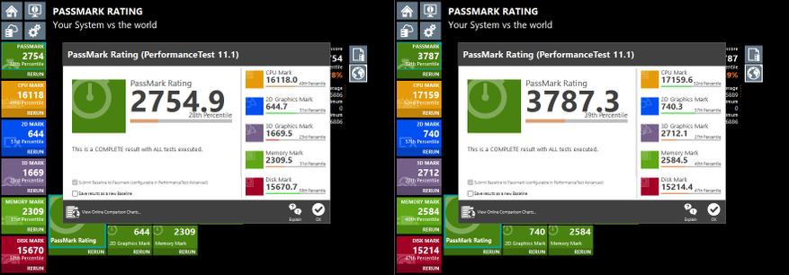 Бенчмарк PerformanceTest 11 показал следующие результаты для одной и двух планок памяти. Здесь хорошо видно, что существенно улучшились показатели графики, немного прибавил процессор в скорости (что почему-то не отразилось в тесте с CPU-Z). Оперативную память этот бенчмарк оценивает как-то комплексно, и по общему знаменателю прибавка получилась не такая существенная.