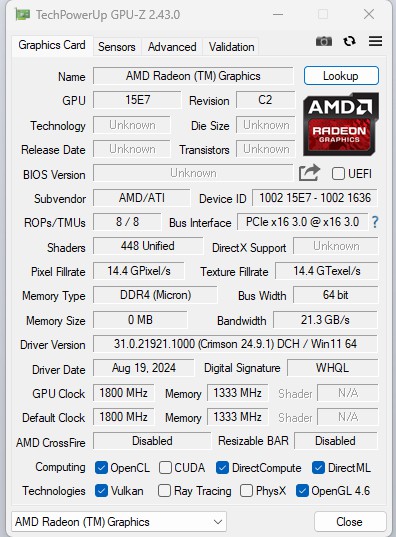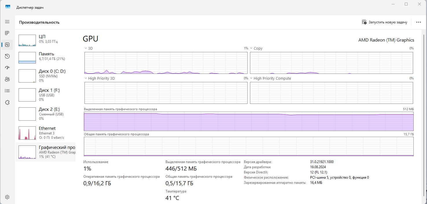 AMD Radeon RX Vega 7 (теперь называется просто Radeon Graphics) имеет 7 графических ядер, 448 шейдерных блока, 8 ROPs, базовую частоту 300 MHz и максимальную 1800 MHz. Видеопамяти всего 512 Mb, но встроенная графика обычно использует и оперативную память в качестве видеопамяти, и, насколько я понял, Radeon RX Vega 7 использует 15,7 Гб. Такие цифры обозначены в диспетчере задач.