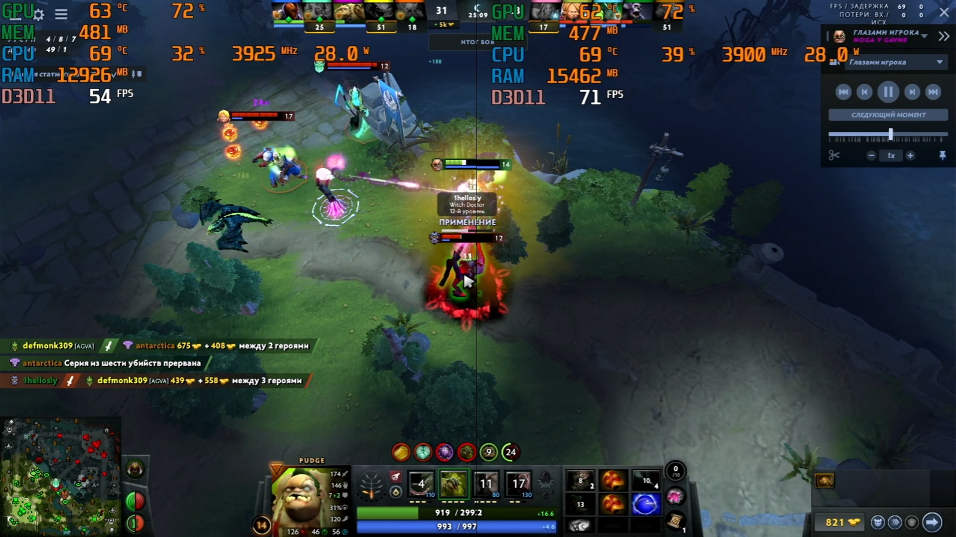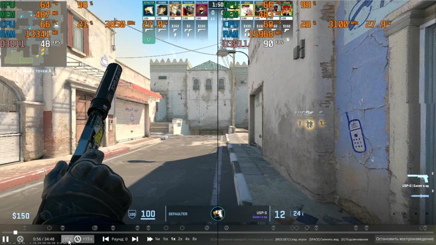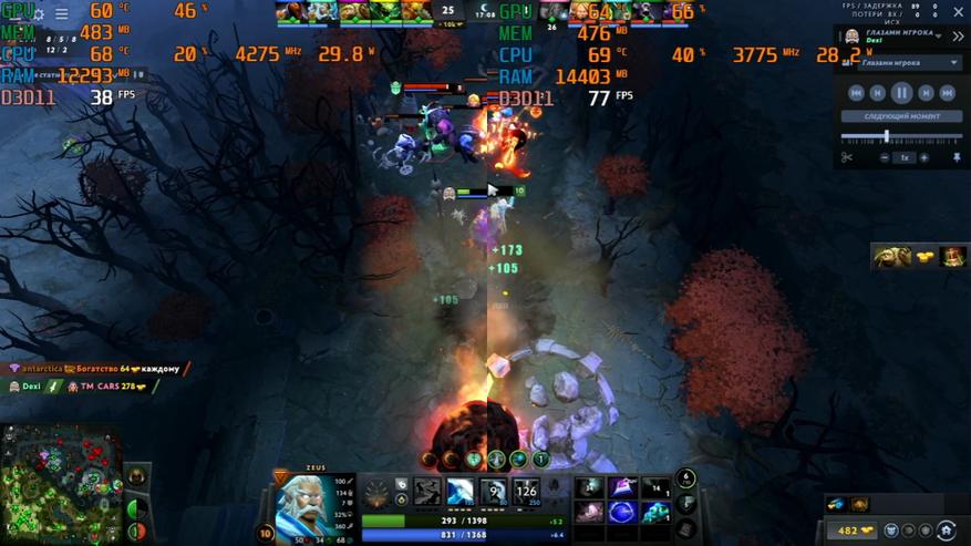 На скриншотах слева значения для 16 Гб, справа — для 32 Гб. Для Dota 2 и WoW2 я использовал свои и чужие (КС2) реплеи, чтобы синхронизировать видео для 16 и 32 Гб. И я также играл во все эти игры и на 16, и на 32 Гб, и FPS в реплеях соответствует FPS в реальной игре. С двумя планками памяти во всех играх заметен существенный прирост FPS от 50% и местами до 100% и даже выше. Проценты я считал в данном случае от значения FPS с 16 Гб, а не от 32.