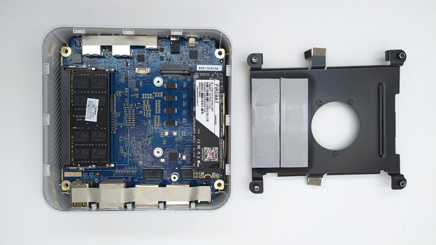 При вскрытии пациента первое, что мы видим, это металлическая пластина, которая выполняет функцию теплоотвода. Правда, термопрокладки предусмотрены только для SSD-накопителей, а оперативная память здесь тоже греется. Я использовал ПК без нижней крышки и чувствовал нагрев пластины при тестах, а сняв ее, почувствовал, что и оперативная память тоже греется, как и SSD. Но в 15-минутном тесте OCCT до критичных температур всё это не нагревается, и тактильно это что-то в районе 55-60 градусов.