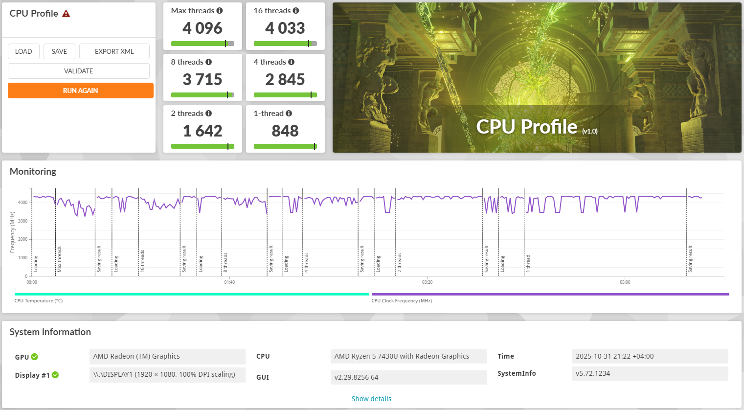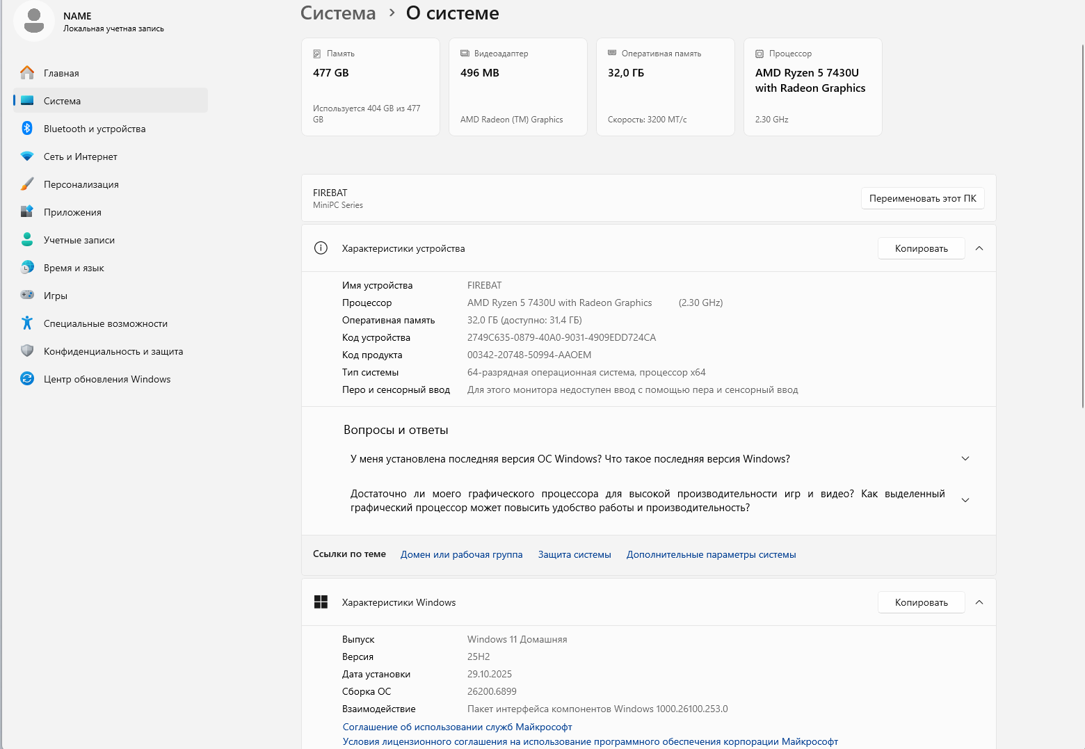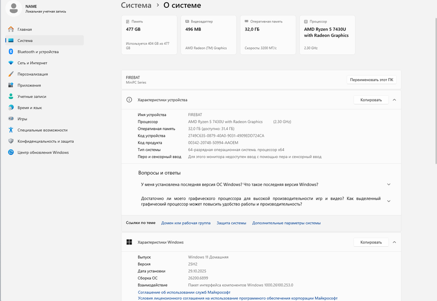 Память, кстати, здесь используется DDR4, и планка памяти стоит вполне неплохая на 3200 МГц. В старшей модели AM02 с процессором AMD Ryzen 5 6600H уже используется DDR5, и в целом аппарат чуть бодрее, чем моя версия. Но на момент покупки мой AM02 с Ryzen 5 7430U стоил заметно дешевле, возможно, попал на акцию, а сейчас я бы доплатил до старшей версии. Но к ней и дополнительная планка памяти выйдет дороже. В общем, расскажу как есть про мой аппарат, а здесь на сайте есть еще обзор на старшую версию, и что будет лучше для вас, вы уже сами решите. На сегодняшний день стоимость AM02 на 7430U колеблется в районе 15-17К рублей.