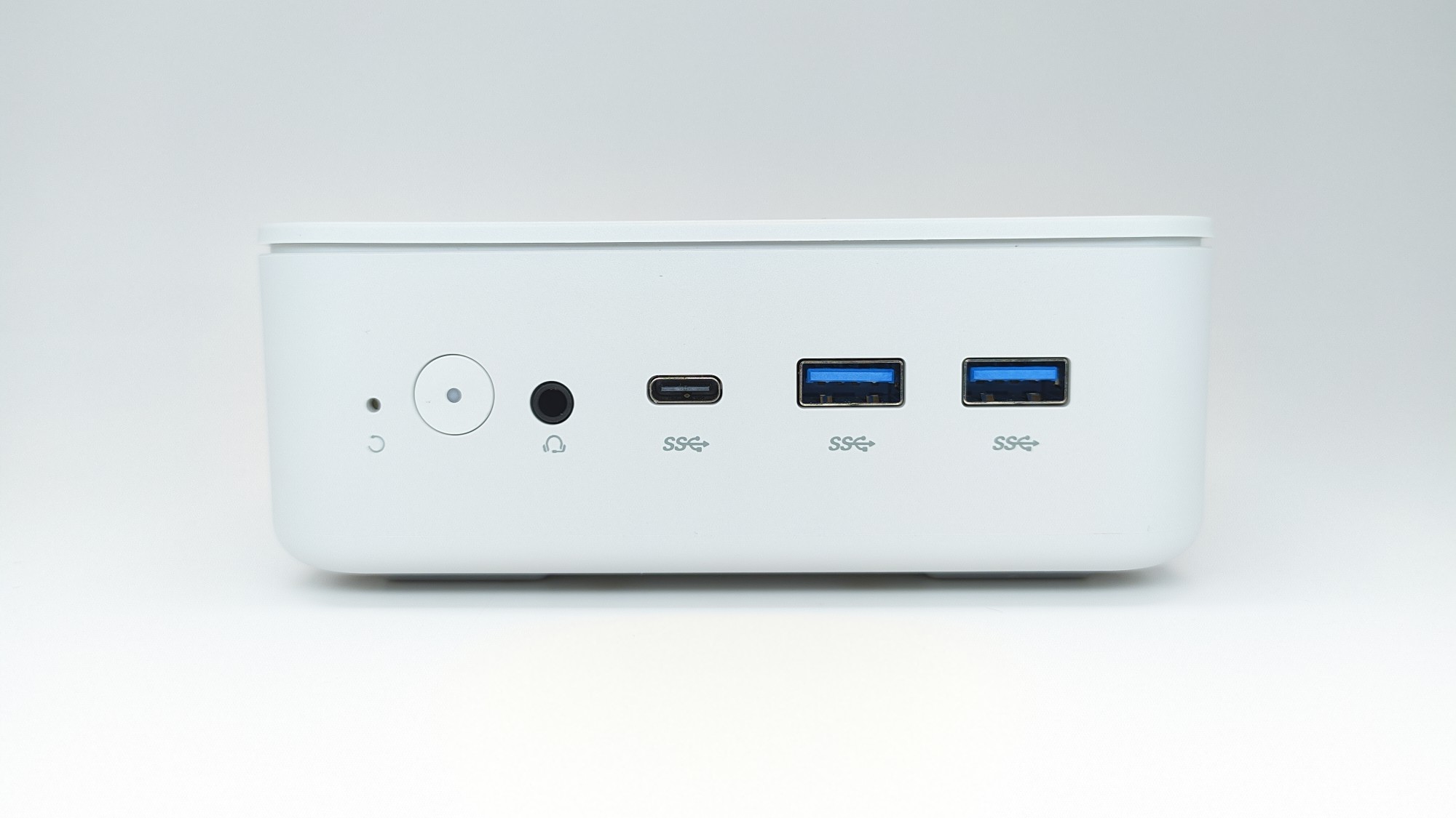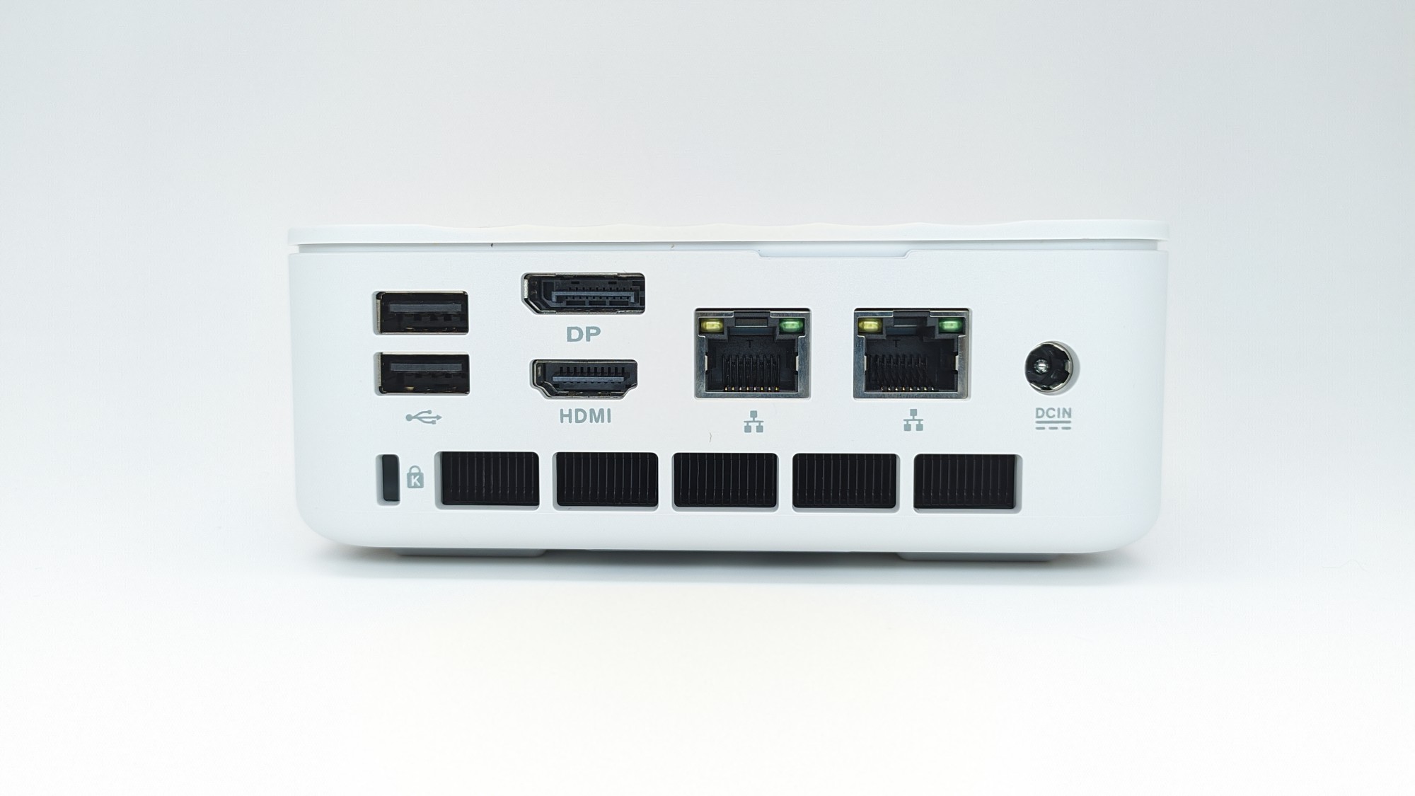 Мини-ПК представляет собой небольшую коробочку со скругленными углами и размерами: ширина — 130 мм, глубина — 127 мм и высота — 50 мм, включая ножки. Вес AM02 что-то около 400 граммов. С левого и правого бока есть решетки пассивной вентиляции.