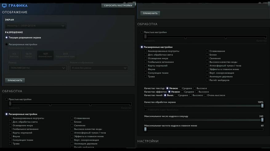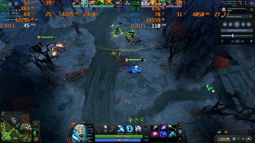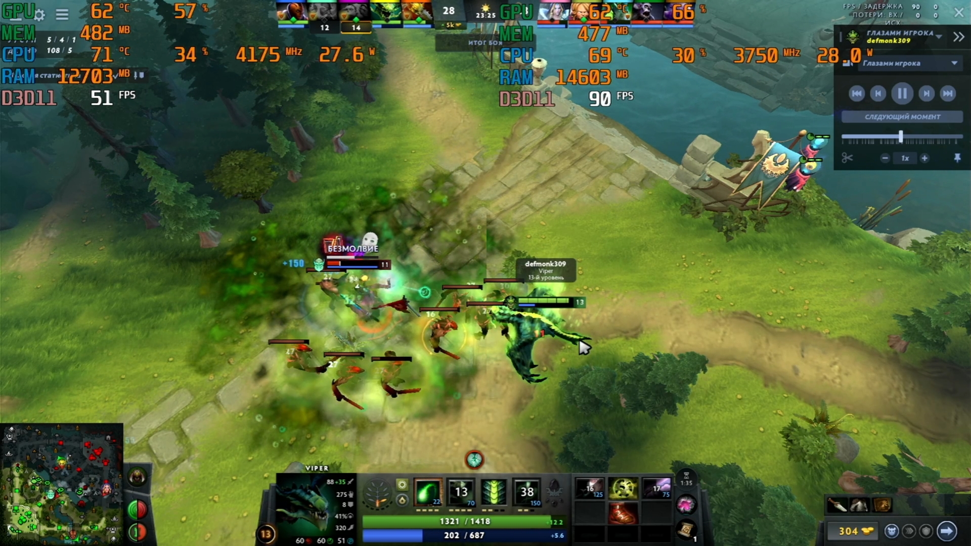 Для Dota 2 все украшательства отключены, но проработка экрана на 100 процентов. FPS заметно отличается от стадии лайнинга, где FPS переваливает с 16х2 Гб памяти и за 100, а в замесах может опускаться до 50 и ниже. Но поиграть можно даже и с 16 Гб.