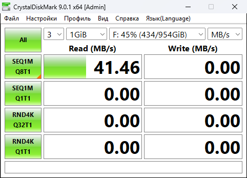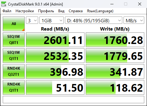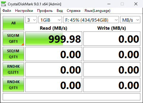Также протестировал программой CrystalDiskMark установленный SSD и все USB-порты. Два передних показали одинаковую скорость с небольшой погрешностью, так же как и два задних, поэтому картинки будут только для одного из каждого типа. В принципе, можно было бы не добавлять отдельный скрин для USB Type-C, т. к. он показал те же 10 Гбит/с, что и передние USB-порты. Все заявленные USB 3.2 Gen 2 порты соответствуют заявленным скоростям. Тесты проводились с помощью внешнего SSD Kingston SXS2000 со скоростями чтения и записи 2000 Мбайт/сек.