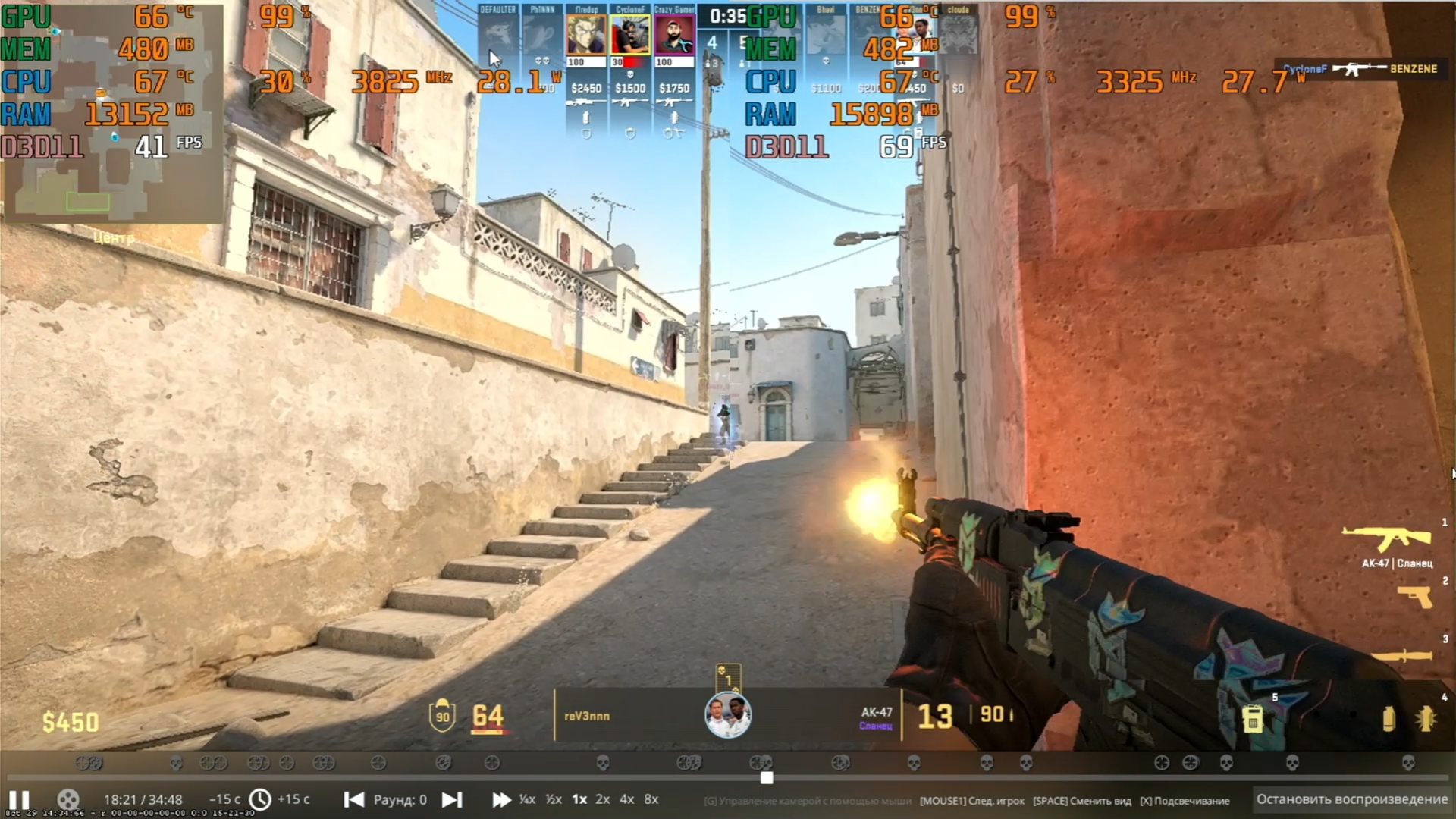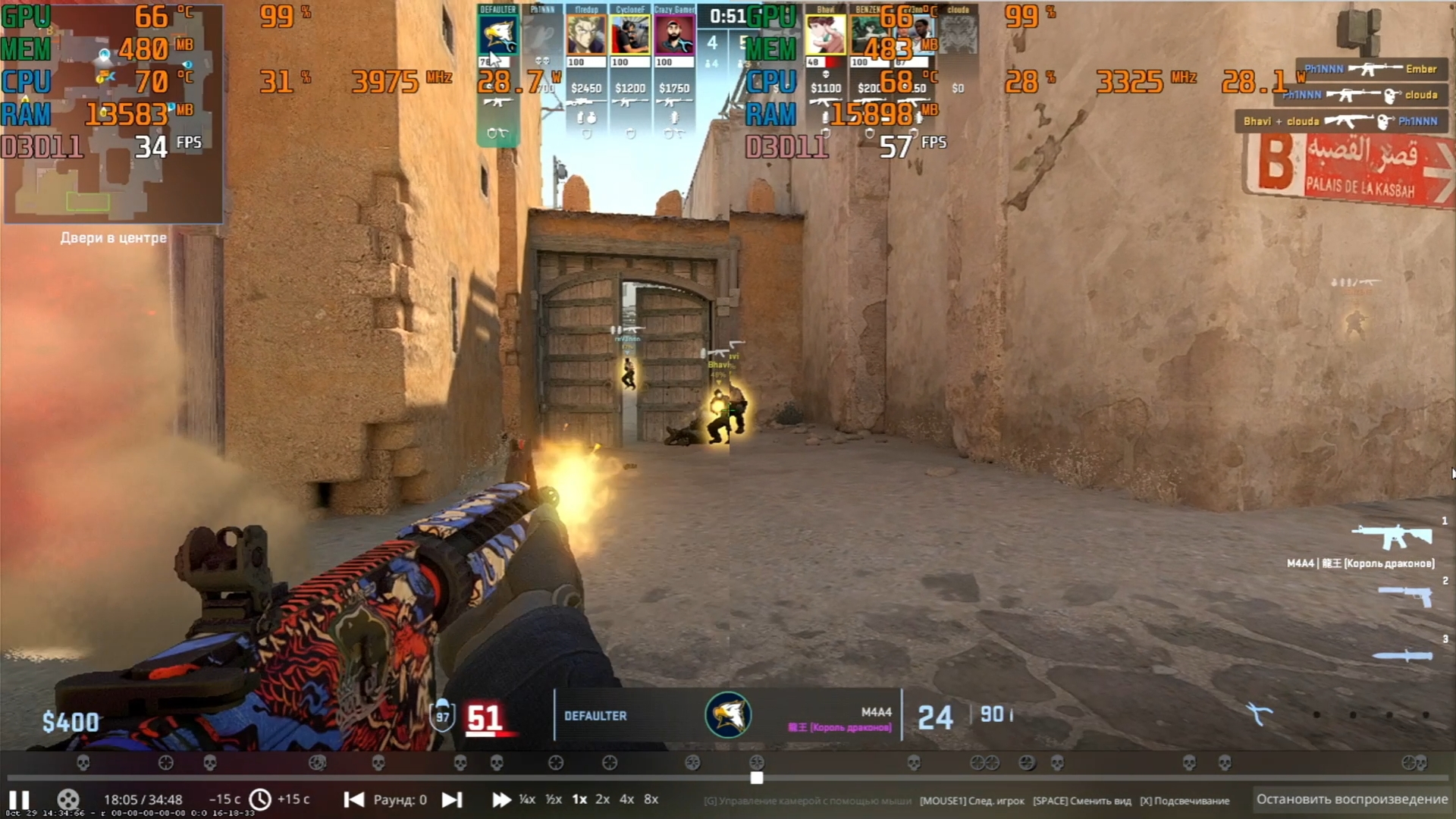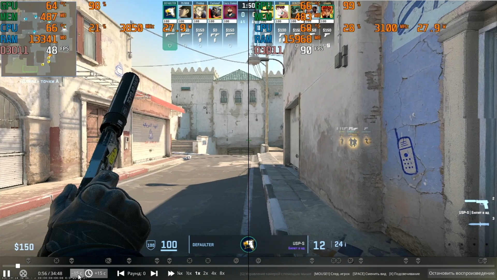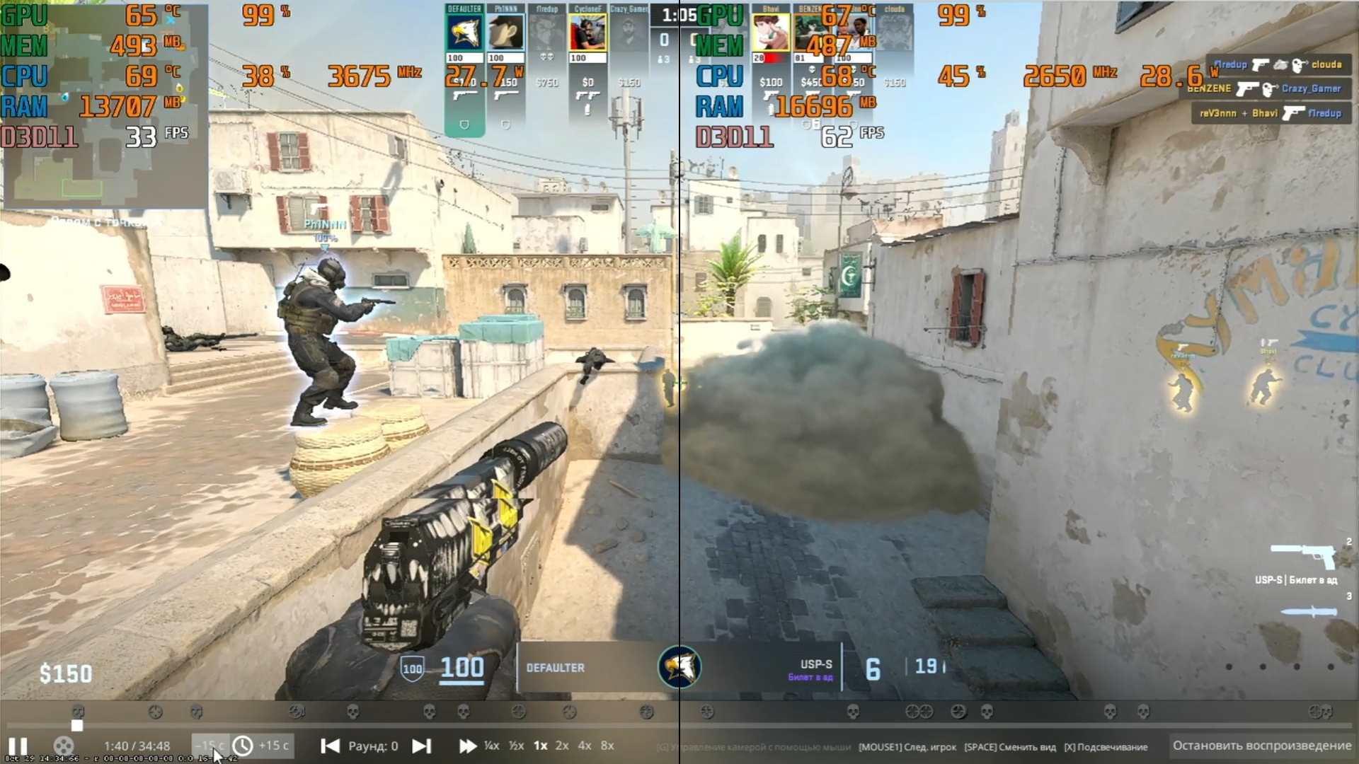 В Counter-Strike очень важен высокий FPS, но если не сильно топить за победу, то можно и просто погонять, пострелять и с 16 ГБ. С 16х2 Гб Гб картина заметно лучше, и геймплей заметно менее «дерганный». Дымовые гранаты дают самую сильную просадку FPS, но в целом играется довольно неплохо.