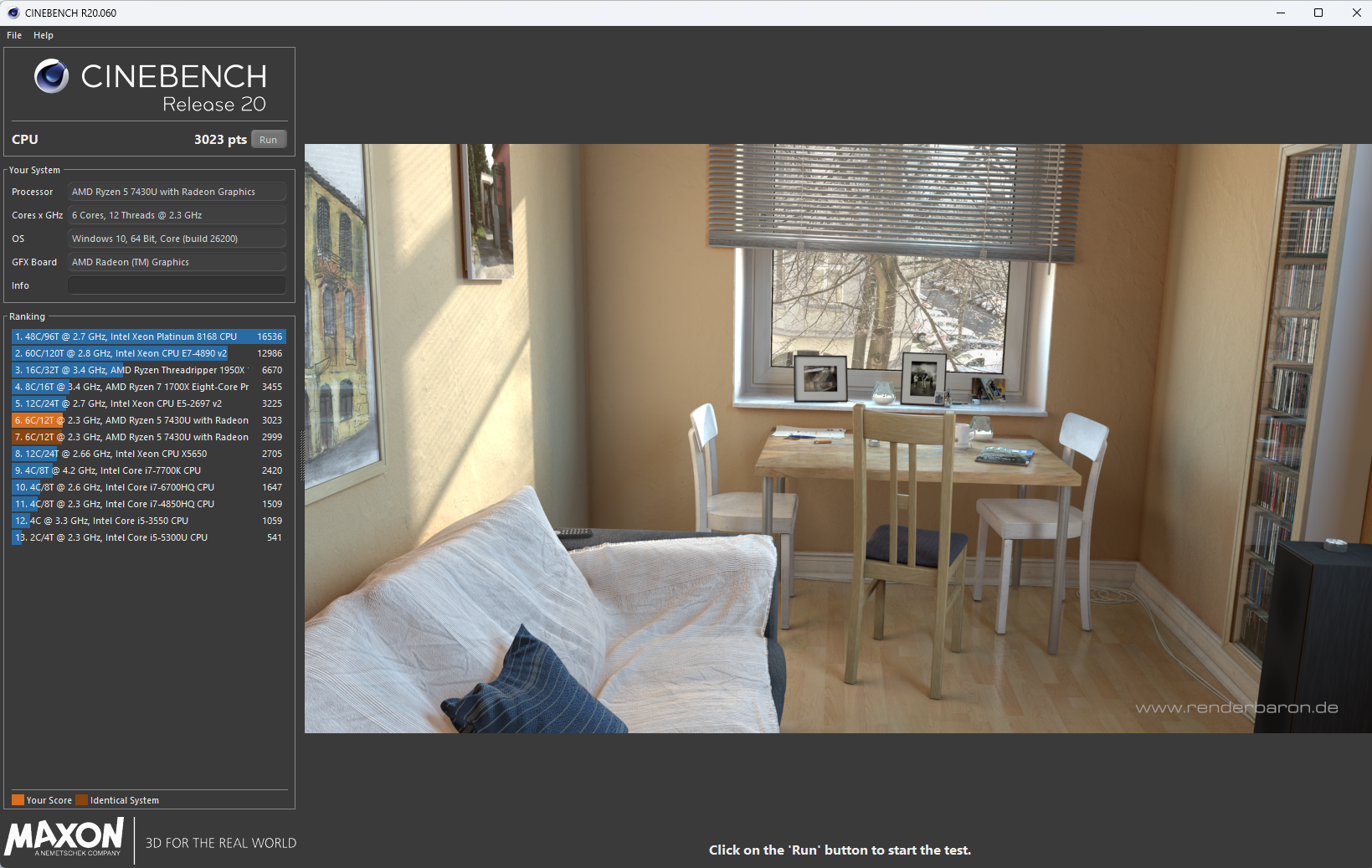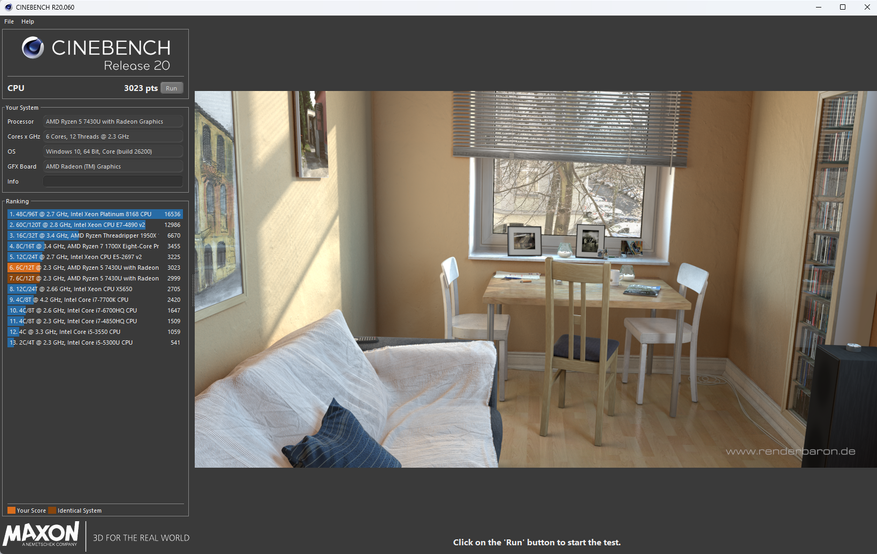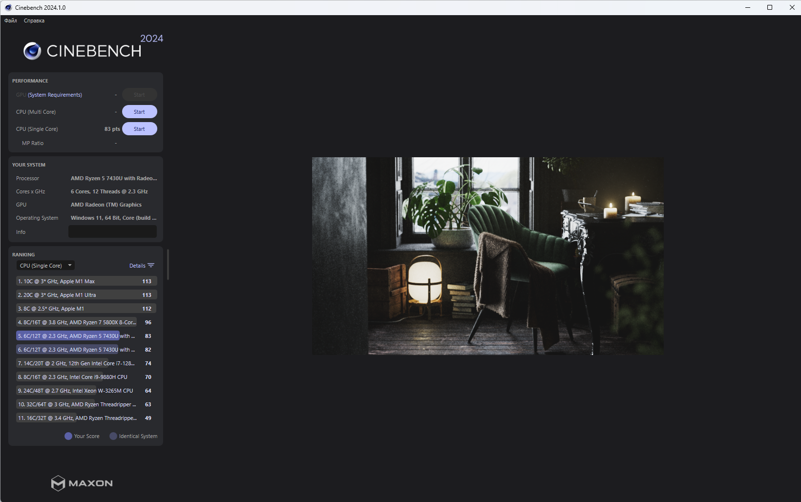 Решил, что не лишним будет прогнать AM02 через бенчмарки Cinebench. Тем более в нем можно сразу посмотреть сравнение с другими моделями процессоров. Ниже результаты для мультипотока Cinebench R20 и Cinebench 2024 для однопоточной производительности и мультипотока. Правда, эти тесты я уже делал с двумя плашками оперативной памяти.