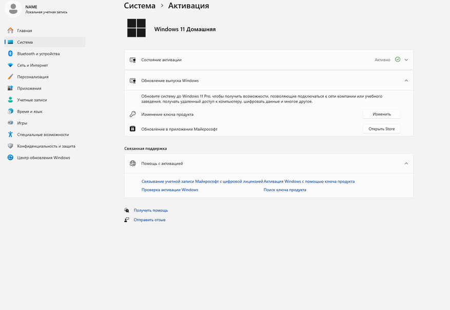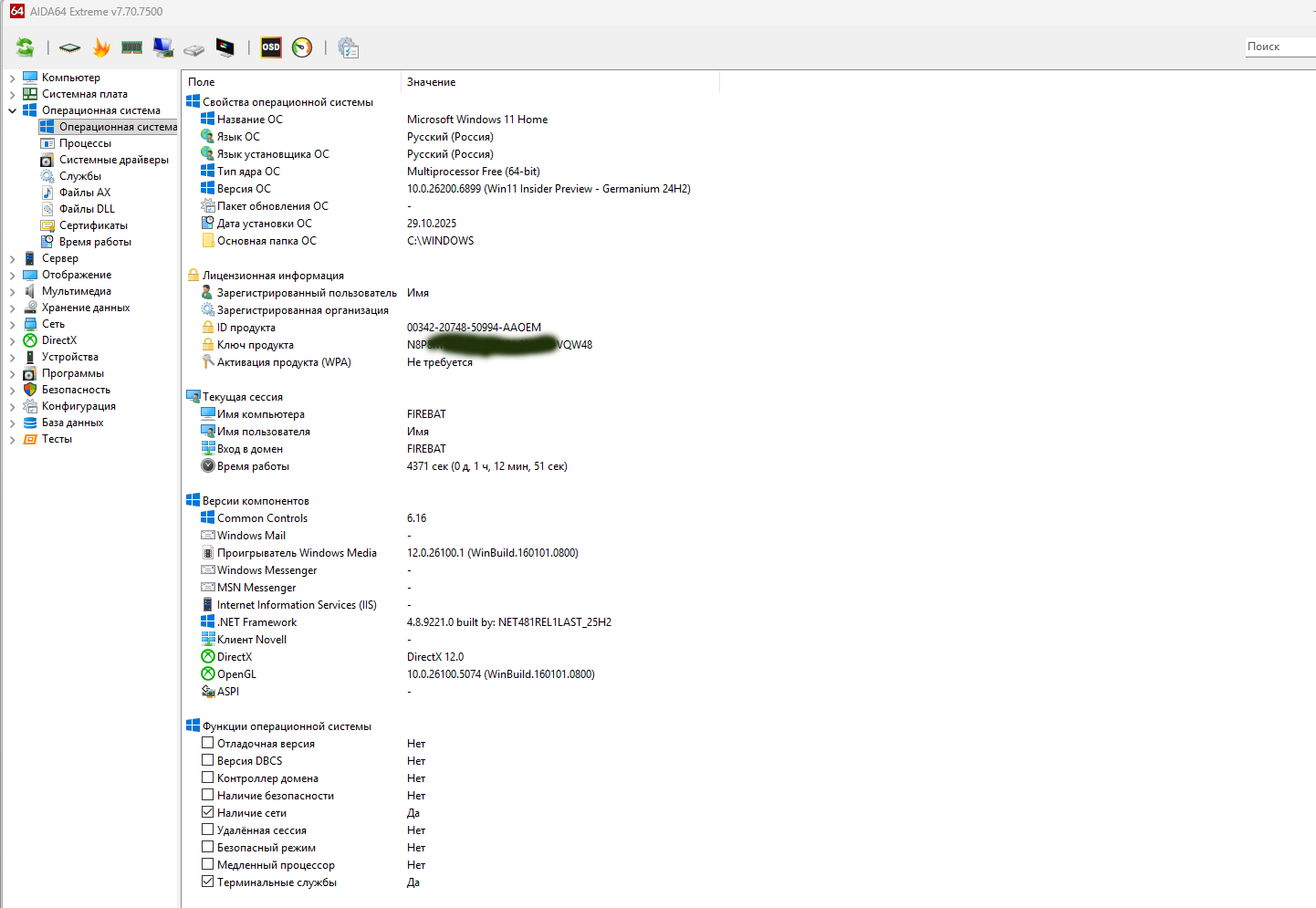 В карточке товара указано, что с завода установлена пробная версия Windows, но у меня была активированная домашняя версия Windows 11. Я бы, конечно, рекомендовал накатить сразу версию Pro от мододелов, почищенную от всяких ненужных служб и приложений. Но, в общем, и так можно пользоваться, так что это дело хозяйское. Если что, ключ активации вашей винды можно посмотреть в AIDA64 в разделе «Операционная система».