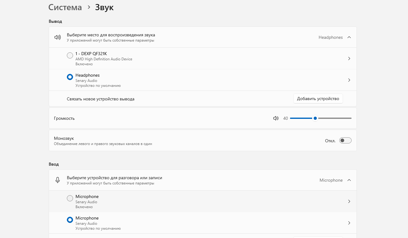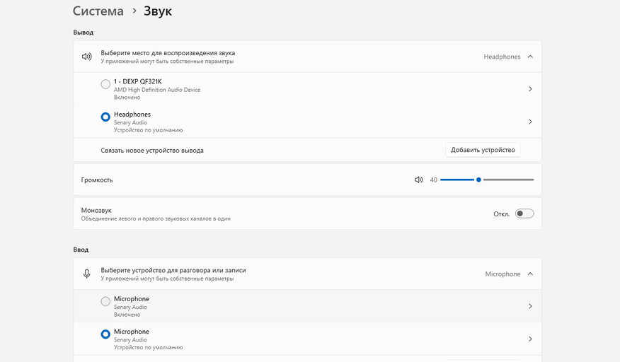 Штатный гибридный аудио-разъем выводит нормальный звук и пишет также нормально. В системе звук определяется как Senary Audio. В моем ноутбуке Mechrevo Kuangshi X 16″ звук определяется также. Как я уже говорил выше, Mechrevo — это еще один бренд Firebat. Когда я смотрел начинку ноутбука, то чип был от Conexant, и здесь тоже от этого производителя, только другой (CX20632-31Z). Не так давно мобильный ЦАП Conexant CX31993 был очень популярен, и в общем он до сих пор хорош. Так что звук здесь нормальный. Любопытно, что устройств для ввода звука в системе с одним и тем же именем отображается два, но только одно работает. Второе можно там же скрыть, просто запретив его.