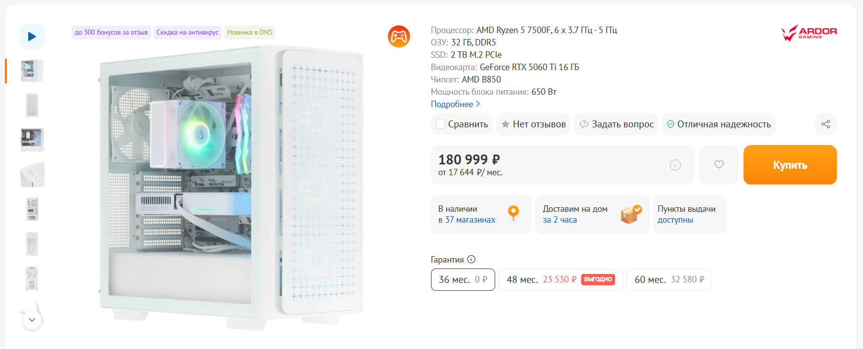 Для готового ПК заявлена гарантия 3 года, но в отличие от маркетплейса, вы по крайней мере сможете дойти до магазина, в котором смогут принять компьютер на обслуживание. Помимо этого, магазин предлагает ряд услуг, в том числе установку операционной системы и чистку от пыли.