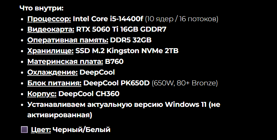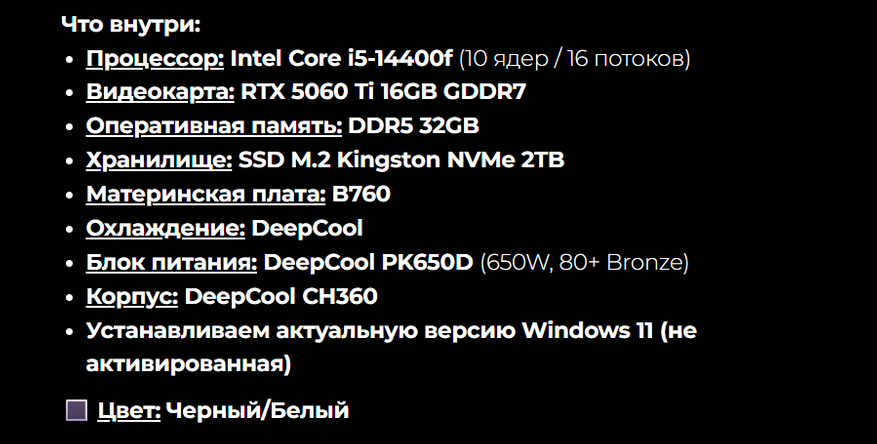 Ассортимент готовых сборок на первый взгляд небольшой, их всего 12, но можно изменить цвет сборки на белый, а также настроить сборку под себя. Для этого имеется удобный конфигуратор, который даже предложит заменить комплектующие, если имеются несовместимые компоненты. В минимальной конфигурации компьютер имеет Core i5-12400F, RTX 5060, 16 ГБ DDR5, 500 ГБ SSD и СЖО.