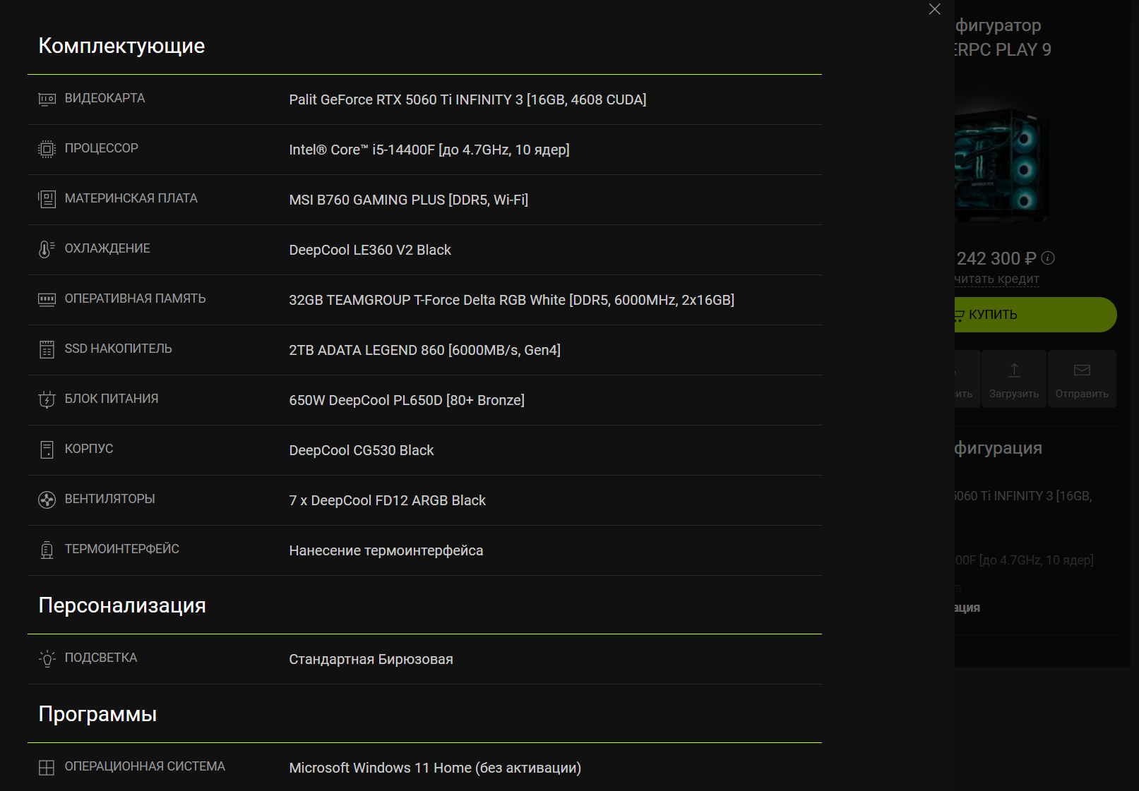 По традиции маркетплейсов немалая часть стоимости ПК ушла на внешний вид. В нашем случае все еще довольно скромно, но есть лоты с куда более странными вариантами, например, удалось найти б/у комплектующие в корпусе за 13 тысяч рублей.