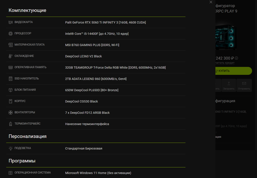 Игровой ПК выглядит достойно, комплектующие подобраны хорошо, дисбаланса нет. Корпус-аквариум с учетом наличия СЖО тут явно не лишний. Установлена не активированная Windows 11.