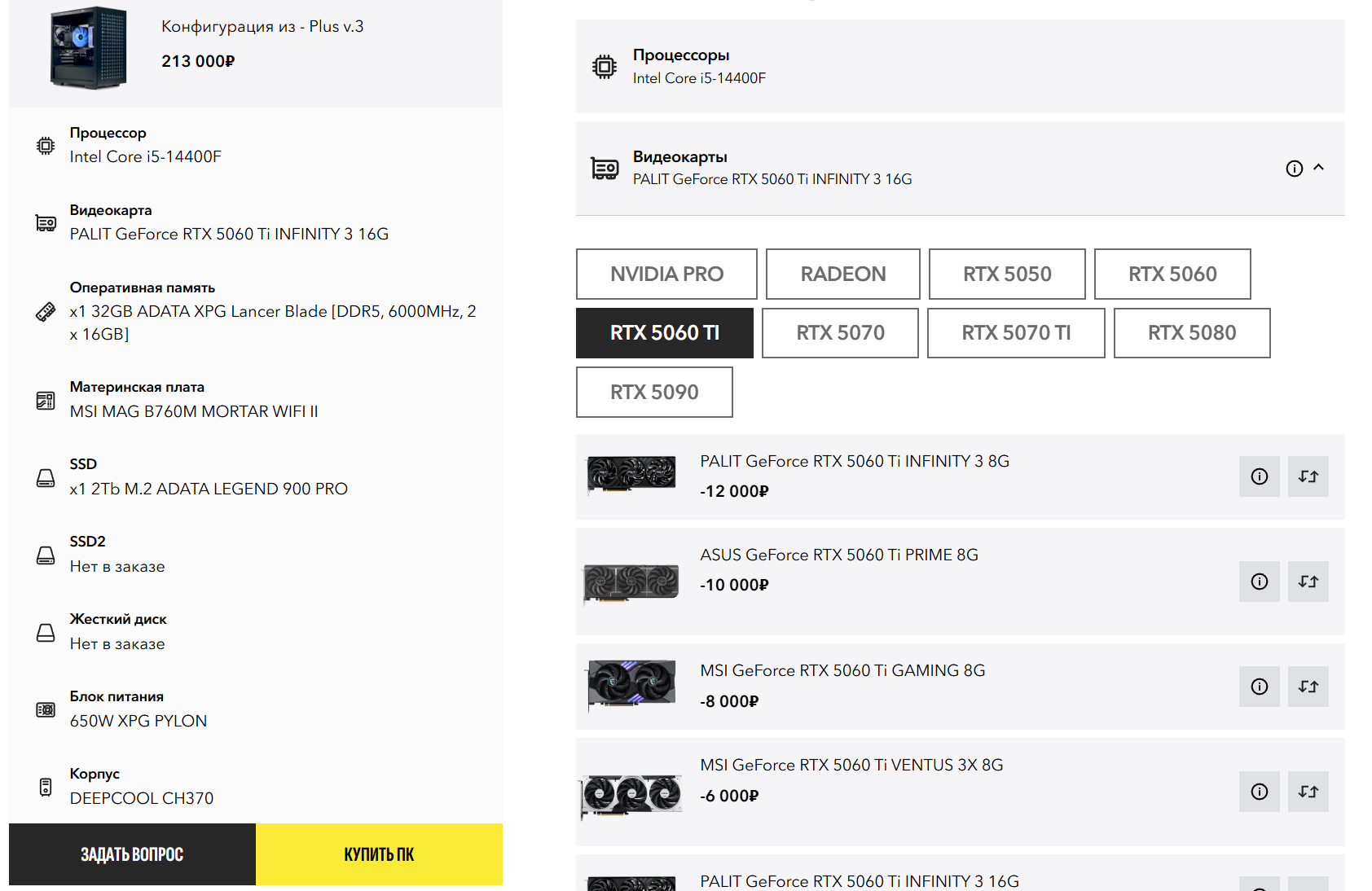 | Видеокарта | RTX 5060 Ti 16GB | RTX 5060 Ti 16GB Infinity 3 | RTX 5060 Ti 16GB Infinity 3 | RTX 5060 Ti 16GB Infinity 3 | RTX 5060 Ti 16GB | RTX 5060 Ti 16GB Ventus 2x |