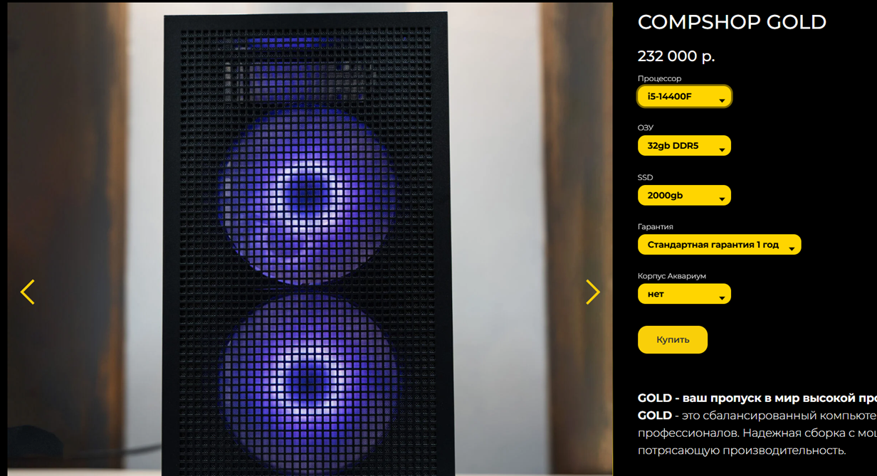 При выборе сборок можно изменить лишь объем памяти, процессор и корпус. В целом этого достаточно, чтобы настроить ПК под себя. Отдельного конфигуратора на сайте нет, необходимо связываться со специалистами, чтобы собрать что-то оригинальное.