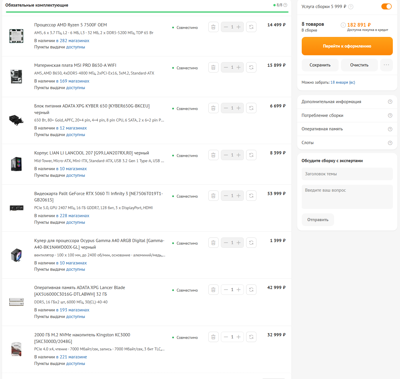 Ассортимент комплектующих весьма достойный, но некоторые позиции имеются только под заказ. Стоит отметить наличие удобного конфигуратора на сайте и большую подборку готовых сборок от посетителей сайта. Их можно взять в качестве основы, если вы не уверены в том, что можете выбрать комплектующие ПК самостоятельно.