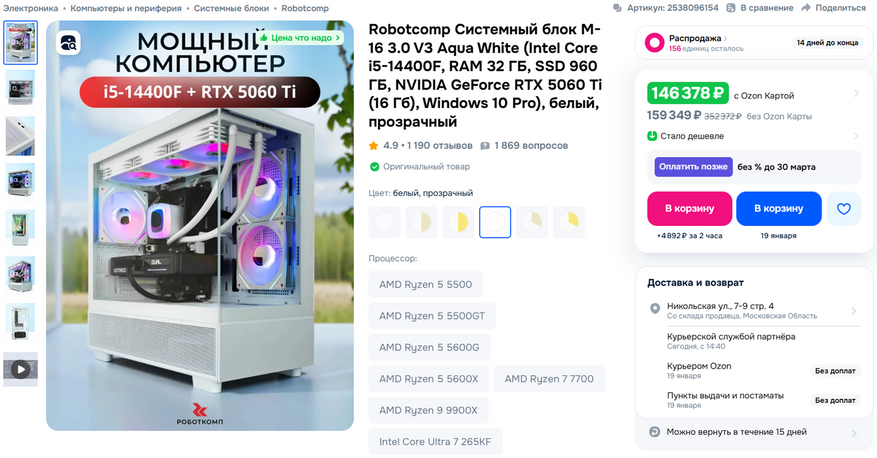 В качестве примера был выбран маркетплейс Ozon. Объем SSD было решено не устанавливать, так как моделей с конфигурацией на 2 ТБ заметно меньше. Не мудрствуя лукаво, выбрав первый же лот получили сборку от RobotComp на Core i5-14400F, RTX 5060 Ti 16 ГБ, 32 ГБ DDR5 и 1 ТБ SSD. При этом какие именно комплектующие доподлинно неизвестно, даже сам продавец не может сказать наверняка до совершения заказа.