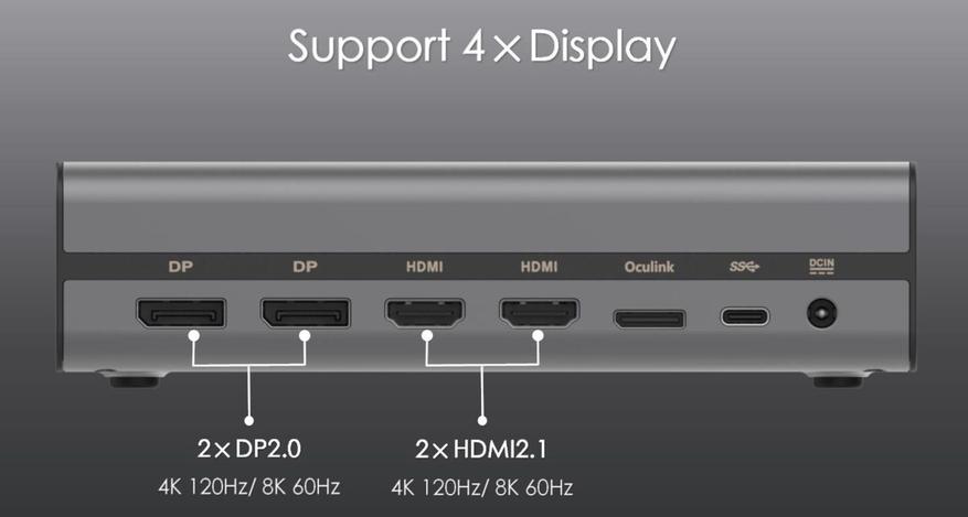Для вывода изображения предусмотрены четыре видеовыхода: два DisplayPort 2.0 и два HDMI 2.1. В комплект поставки входит блок питания мощностью 240 Вт. Главным недостатком новинки, как и других подобных решений, является невозможность замены графического процессора на более производительный в будущем.