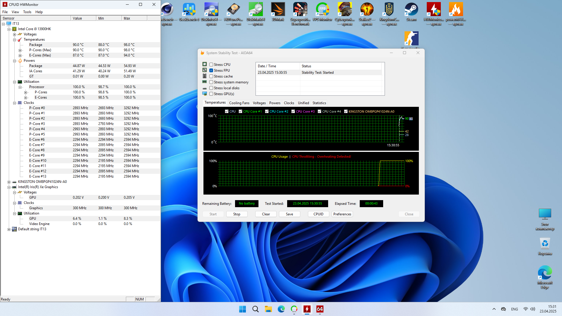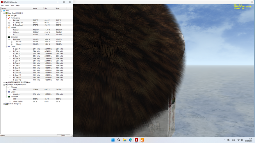 Герой обзора основан на процессоре Intel i9 13900HK, который отличается от i9 13900H только лишь разблокированным множителем. У него всё также 20 потоков, который набираются шестью P-ядрами и восемью E-ядрами, работающие на частотах 5,4 и 4.1 ГГц в турбо соответственно. Теплопакет у процессора стандартный это 45 Вт, который может быть расширен на усмотрение вендором до 115 Вт, сколько в итоге здесь будет, узнаю позже. В паре с этим процессором работает на мое удивление память DDR4, здесь два слота заняты двумя планками по 16 ГБ каждая с частотой 3200 МГц. С таким процессором логичнее было бы установить память DDR5.
