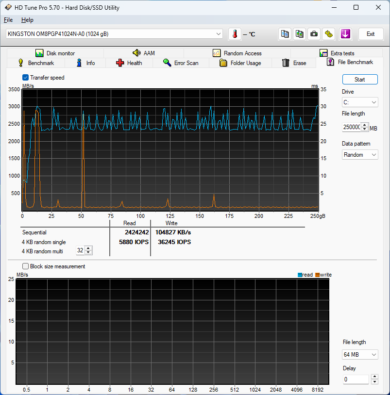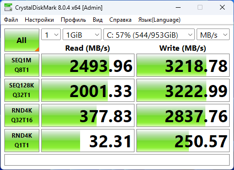 В данном компьютере установлен бюджетный NVME SSD от Kingston, с интерфейсом PCIe 4 с четырьмя линиями. Результаты у него соответствующие, это просто бюджетный накопитель, от которого не следует ждать высоких показателей записи и чтения, но которого достаточно для каких-то домашних работ или другой работы которая не нагружает направленно подсистему хранения. Во время тестов с накопителем он не прогрелся выше 70°, что очень даже неплохо.