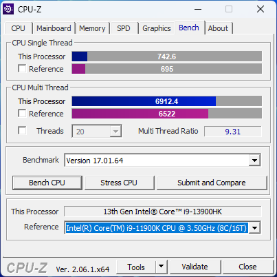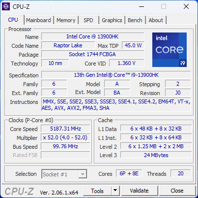 | Процессор | i9-13900HK: 6 P-ядер с поддержкой HT на частоте от 2,6 ГГц до 5,4 ГГц, 8 E-ядер на частоте от 1,9 ГГц до 4,1 ГГц; TDP 45 Вт (до 115 Вт) |